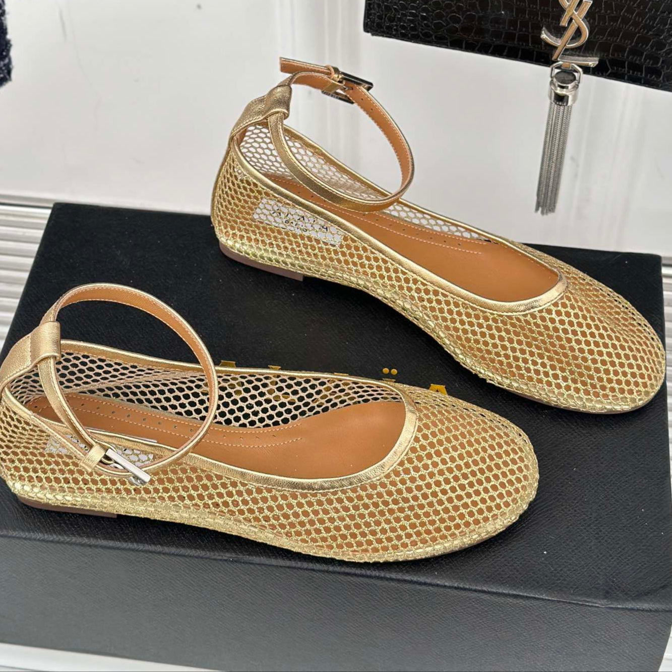 ALAIA MARY JANE FLATS white mix metallic champagne gold woven calfskin pattent