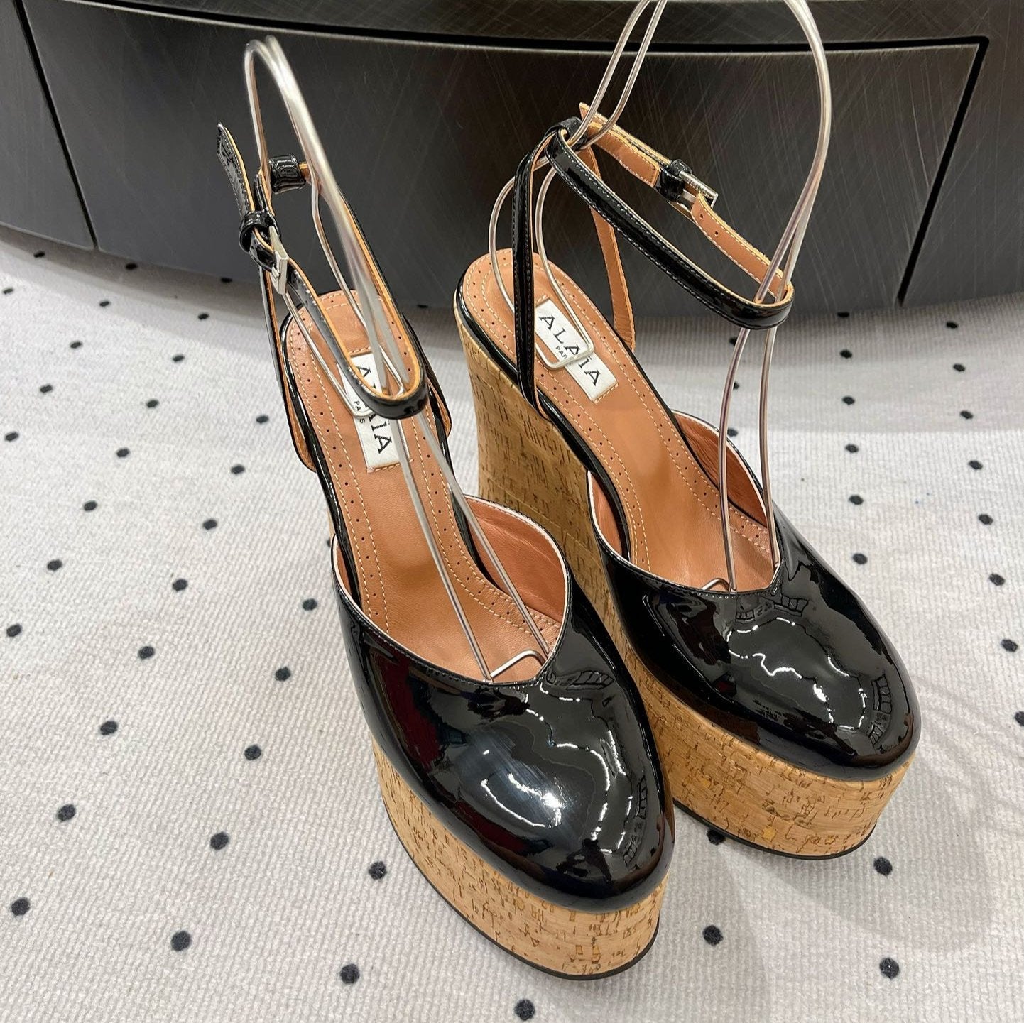 Alaila Wedge Sandals 115mm In Black Glossy Lambskin 954887