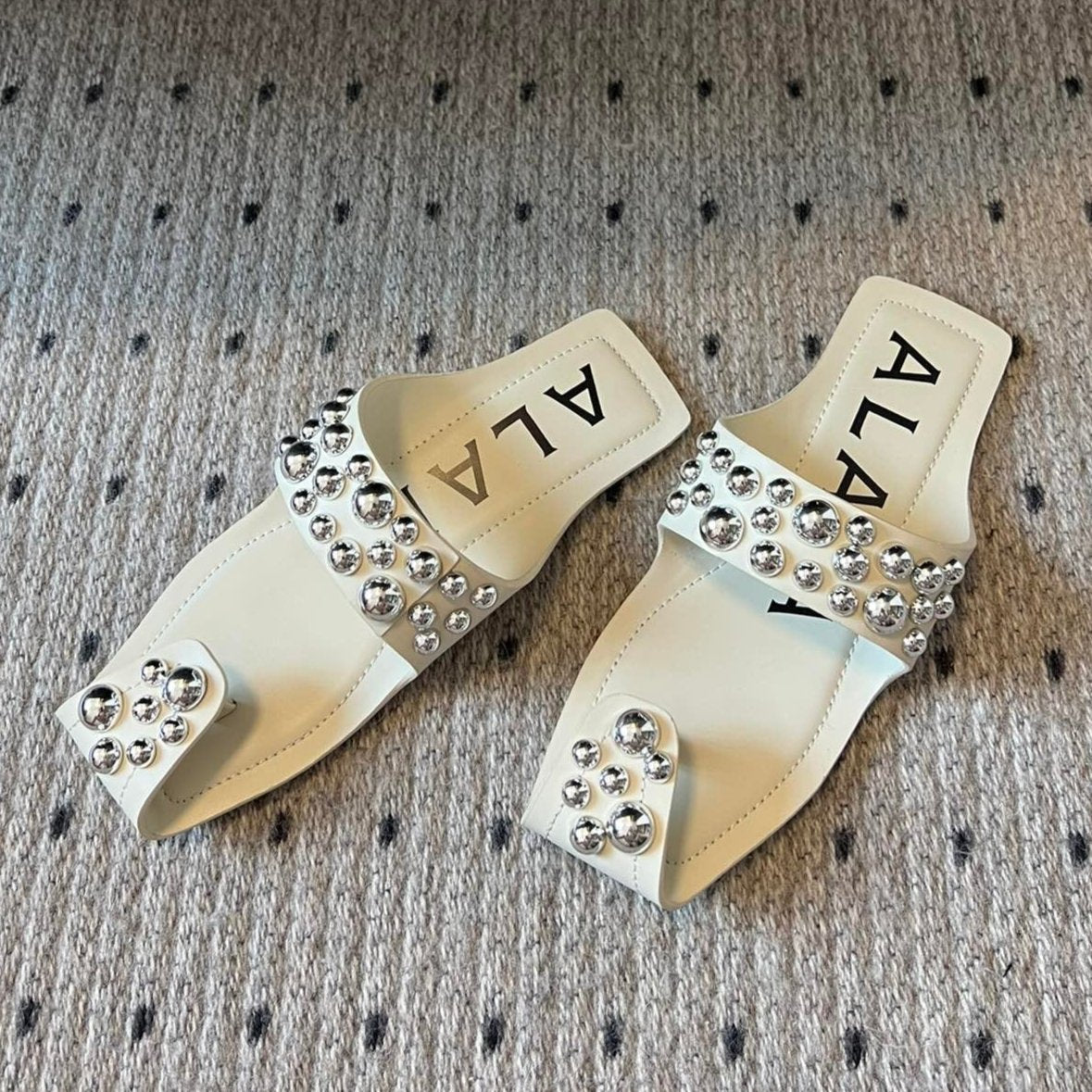 ALAIA FOLDED FLAT MULES WITH SPHERES ON WHITE CALFSKIN