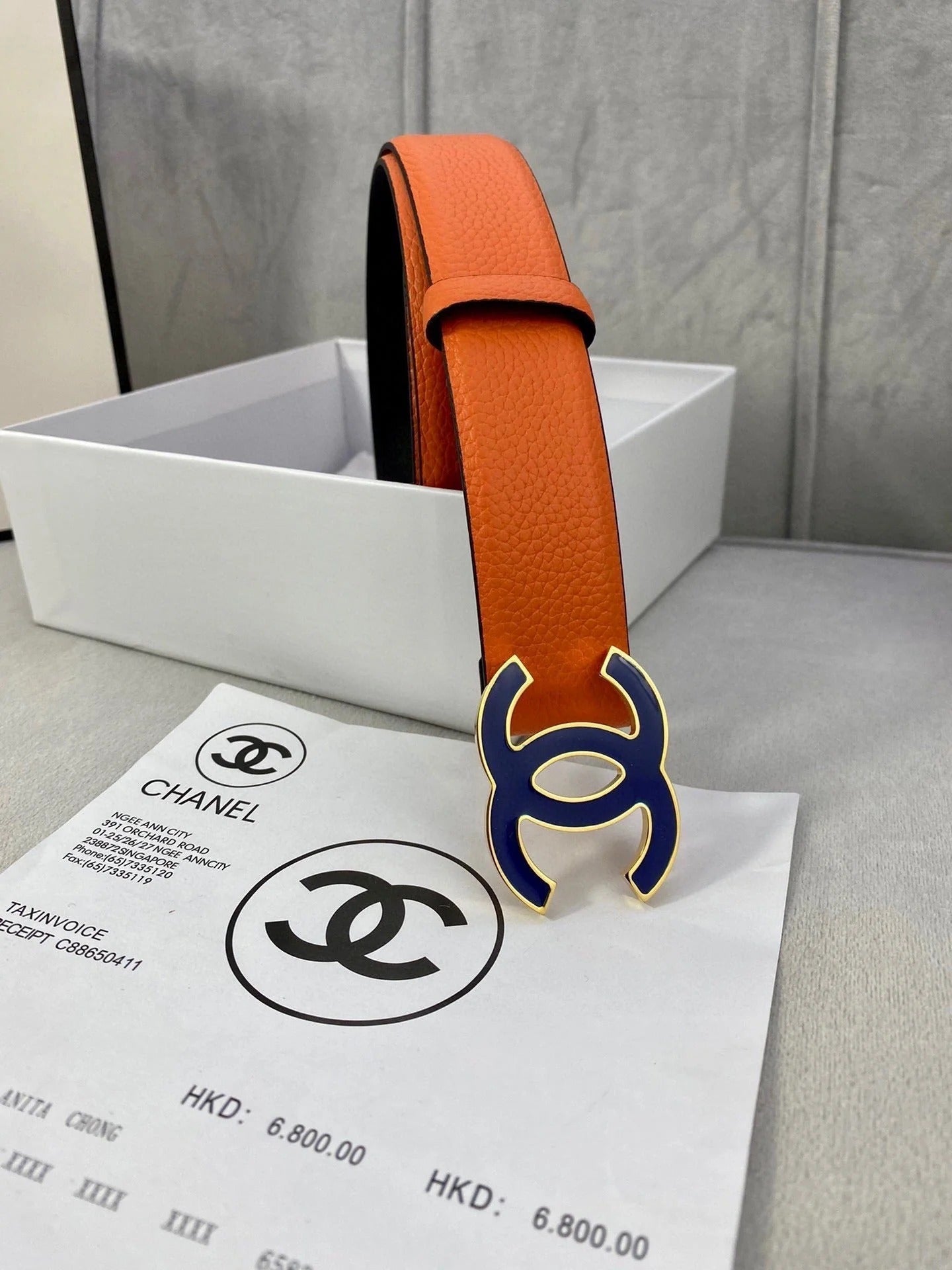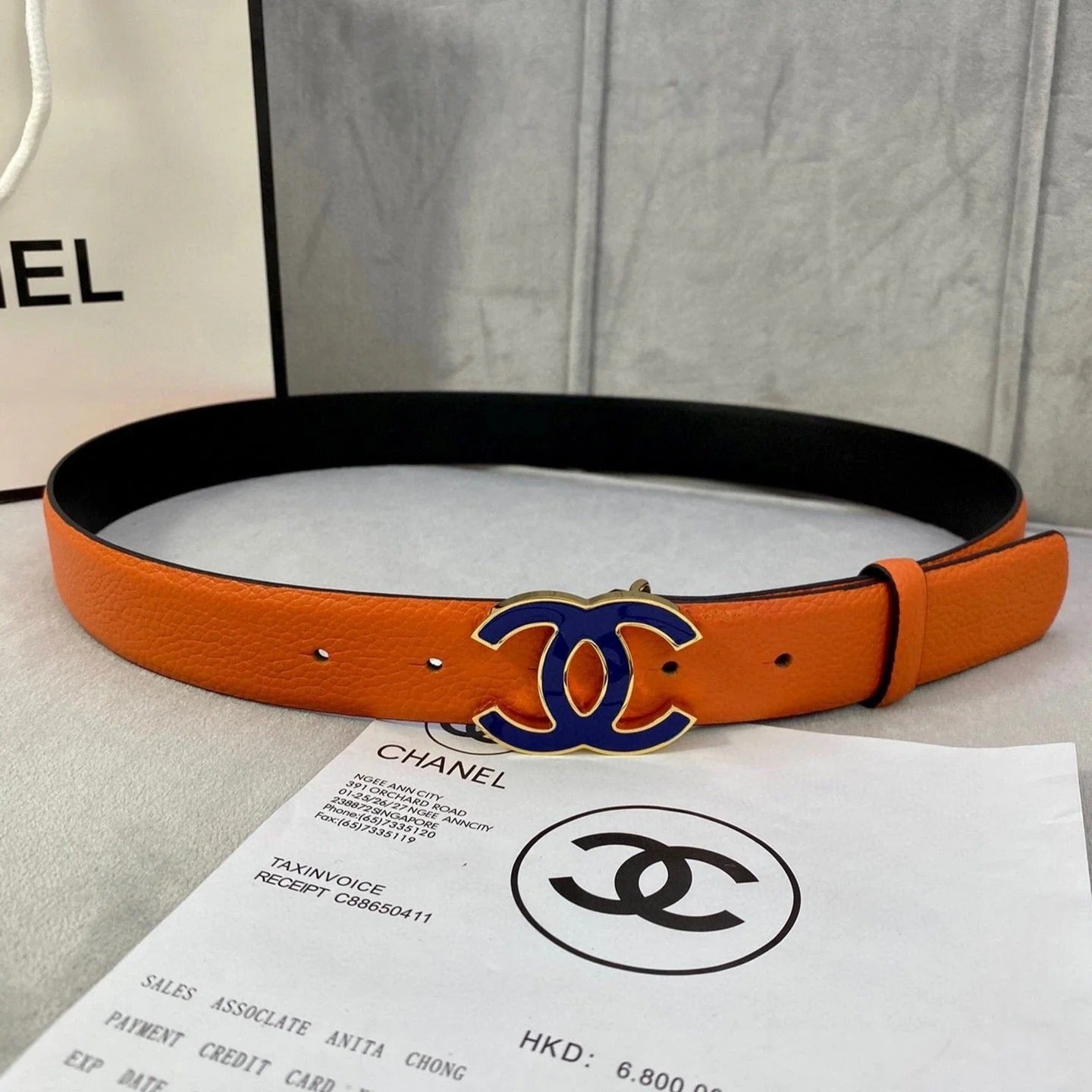 CC 30MM BELT IN FIRE ORANGE GRAINED CALFSKIN WITH NAVY BLUE METAL LOGO