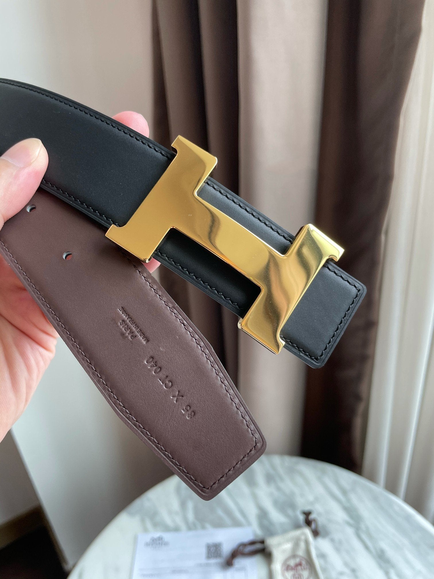H CONSTANCE BELT 38MM GOLD BUCKLE BLACK CHOCOLATE LEATHER