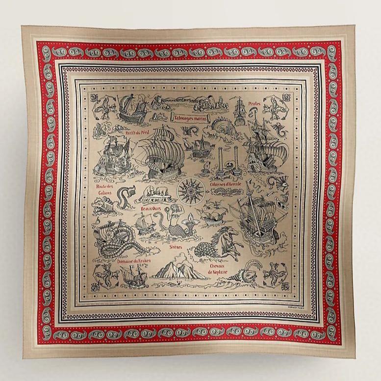 Tatouages Marins Bandana Shawl 135 CM Dark Blue Mix White Red Cashmere And Silk 401090
