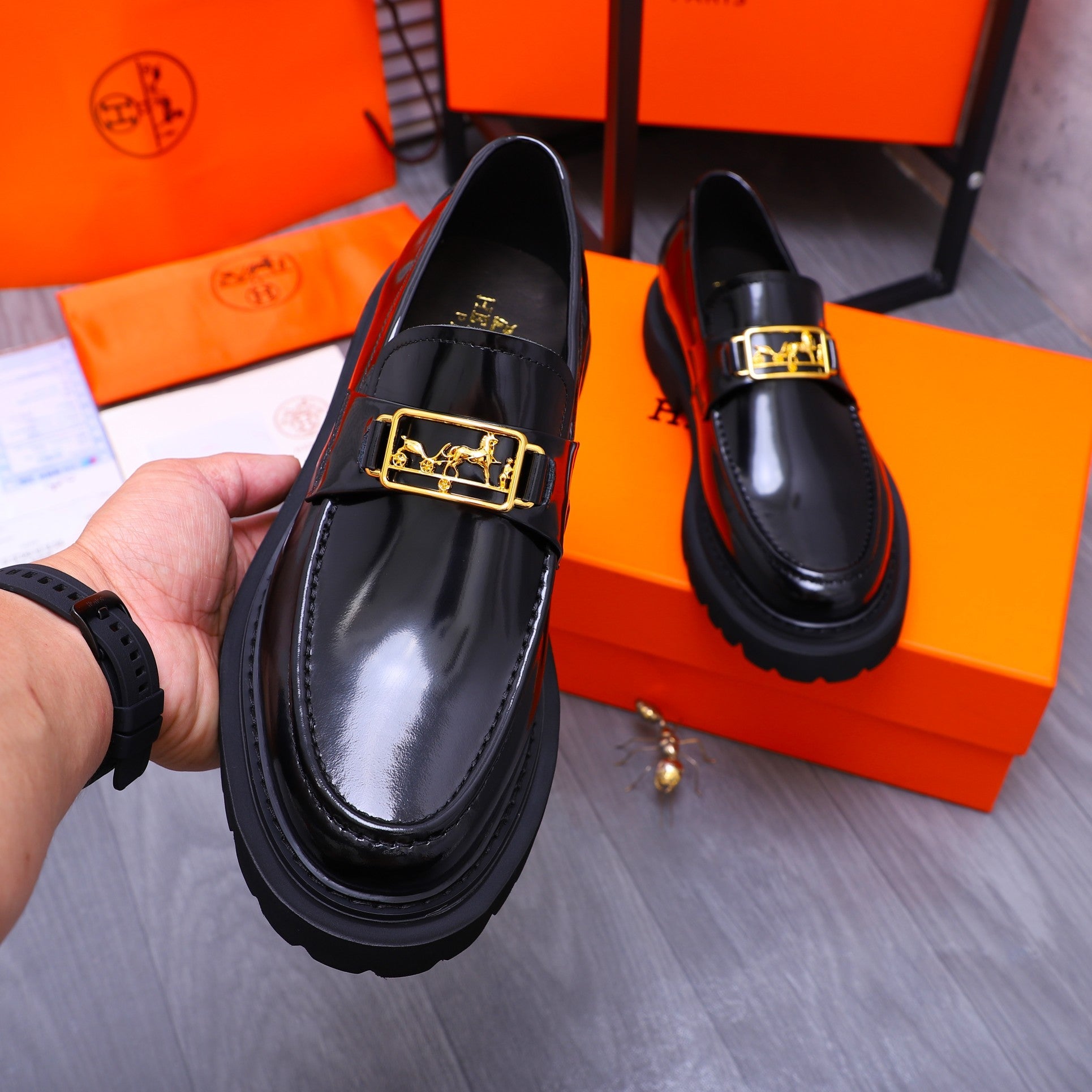 HM GOLD BUCKLE LOAFER GLOSSY BLACK CALFSKIN