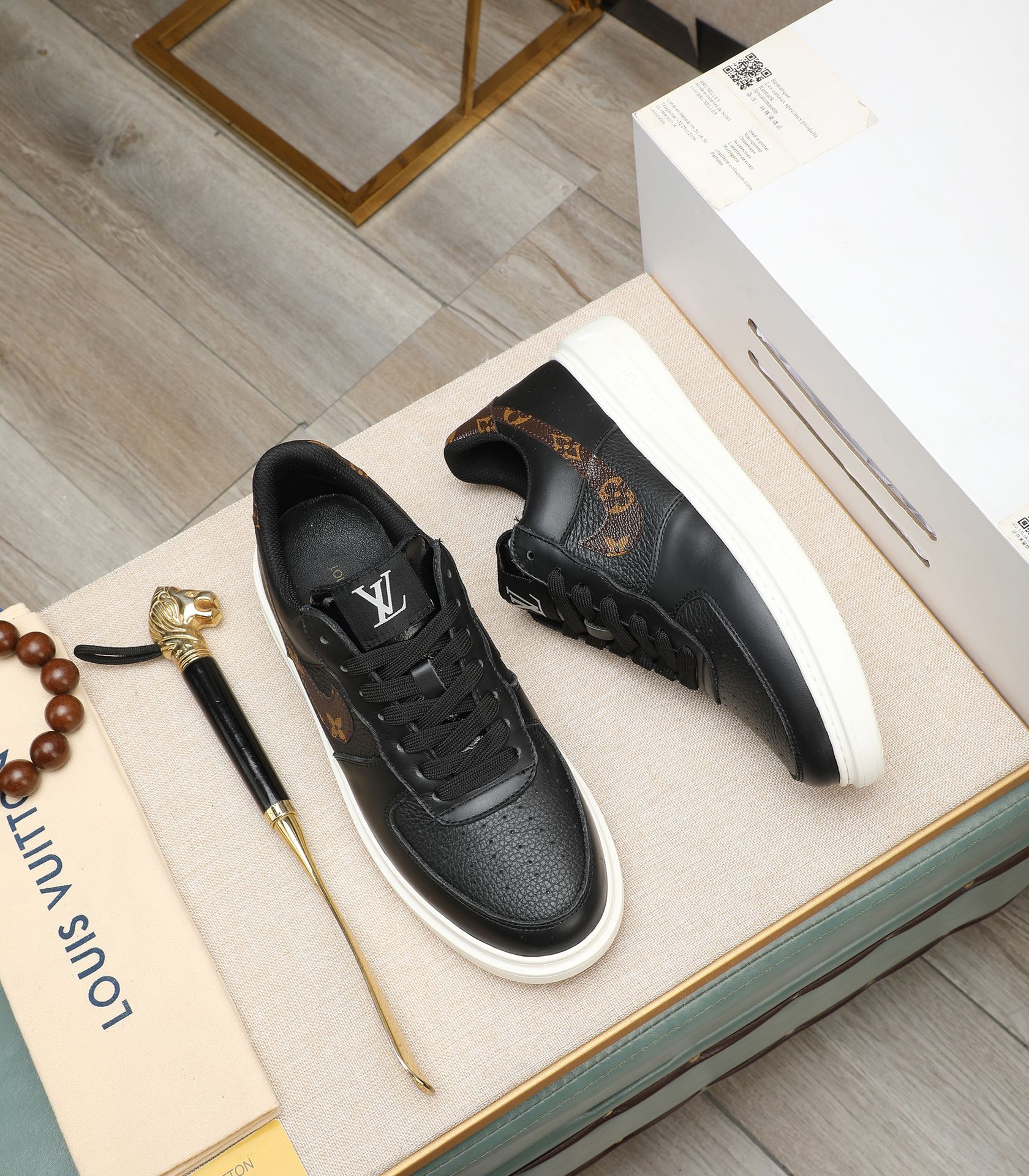 LV AIR FORCE 1 GLOSSY BLACK CALFSKIN WITH BROWN MONOGRAM LOGO