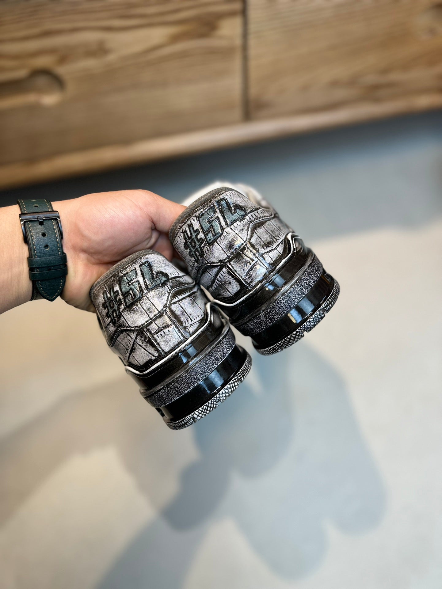 • Upper: "Stone grain cowhide, color-changing technique, with plastic logo on the upper and tongue of the shoe."
