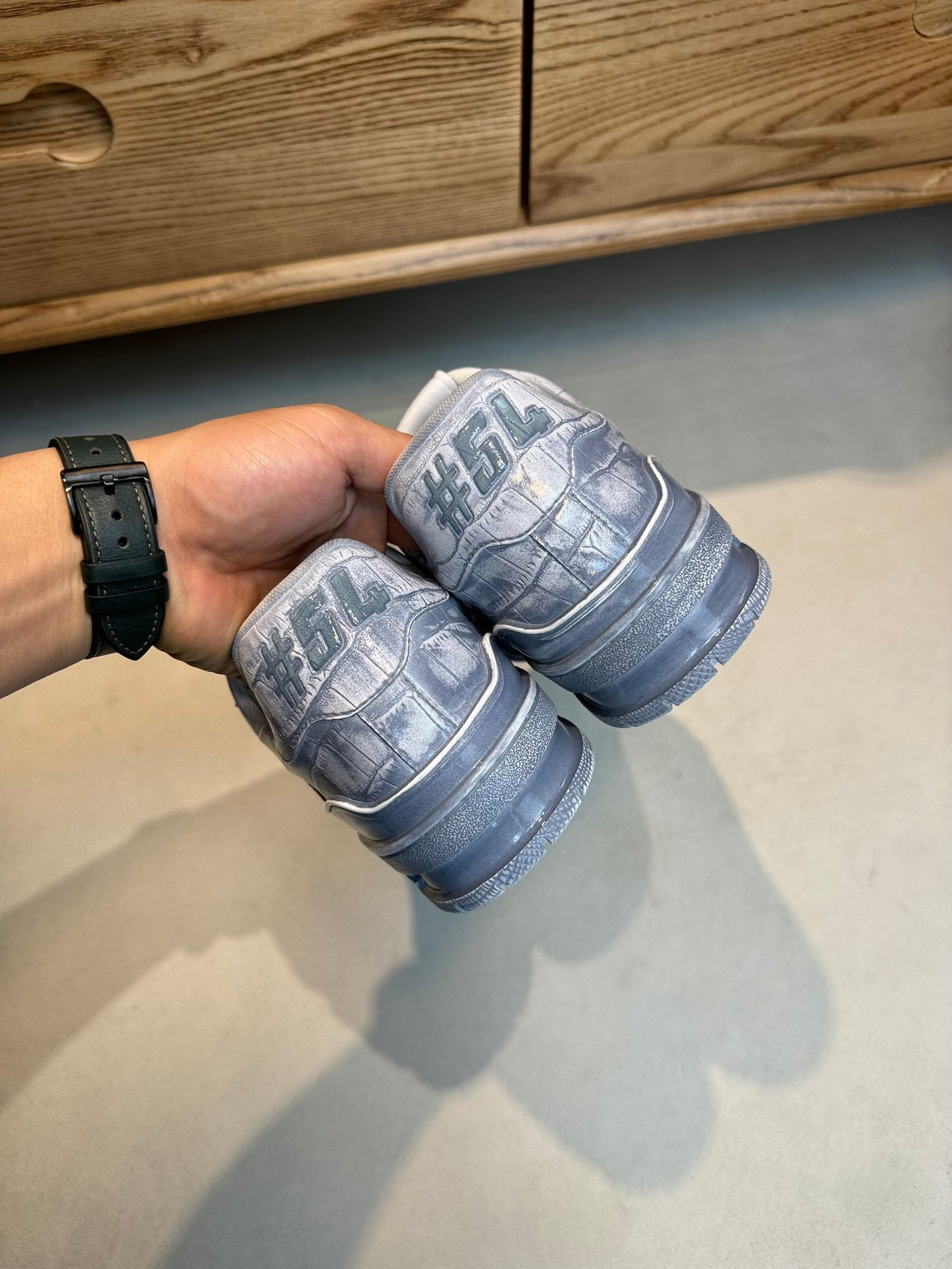 • Upper: "Stone grain cowhide, color-changing technique, with plastic logo on the upper and tongue of the shoe."