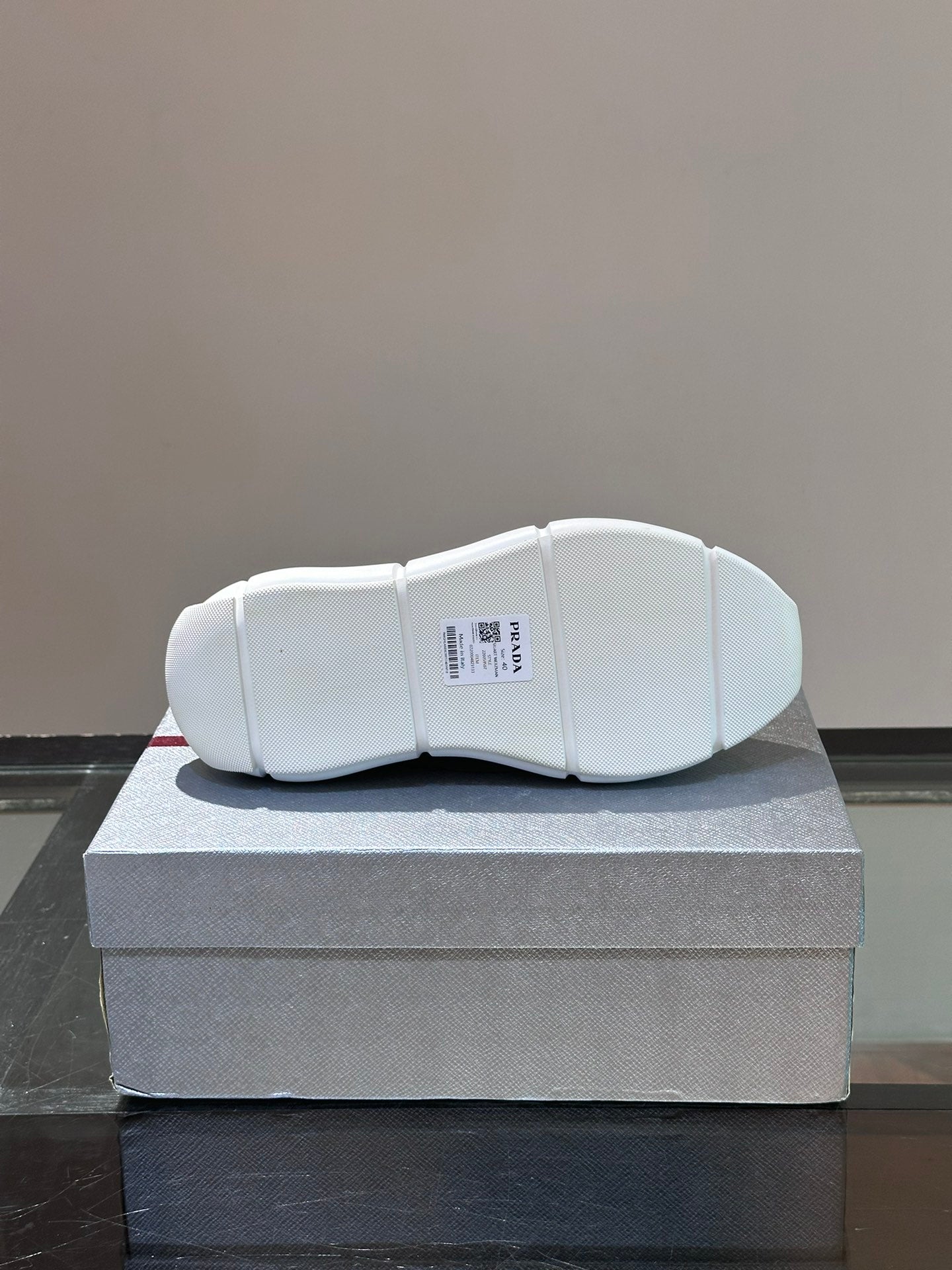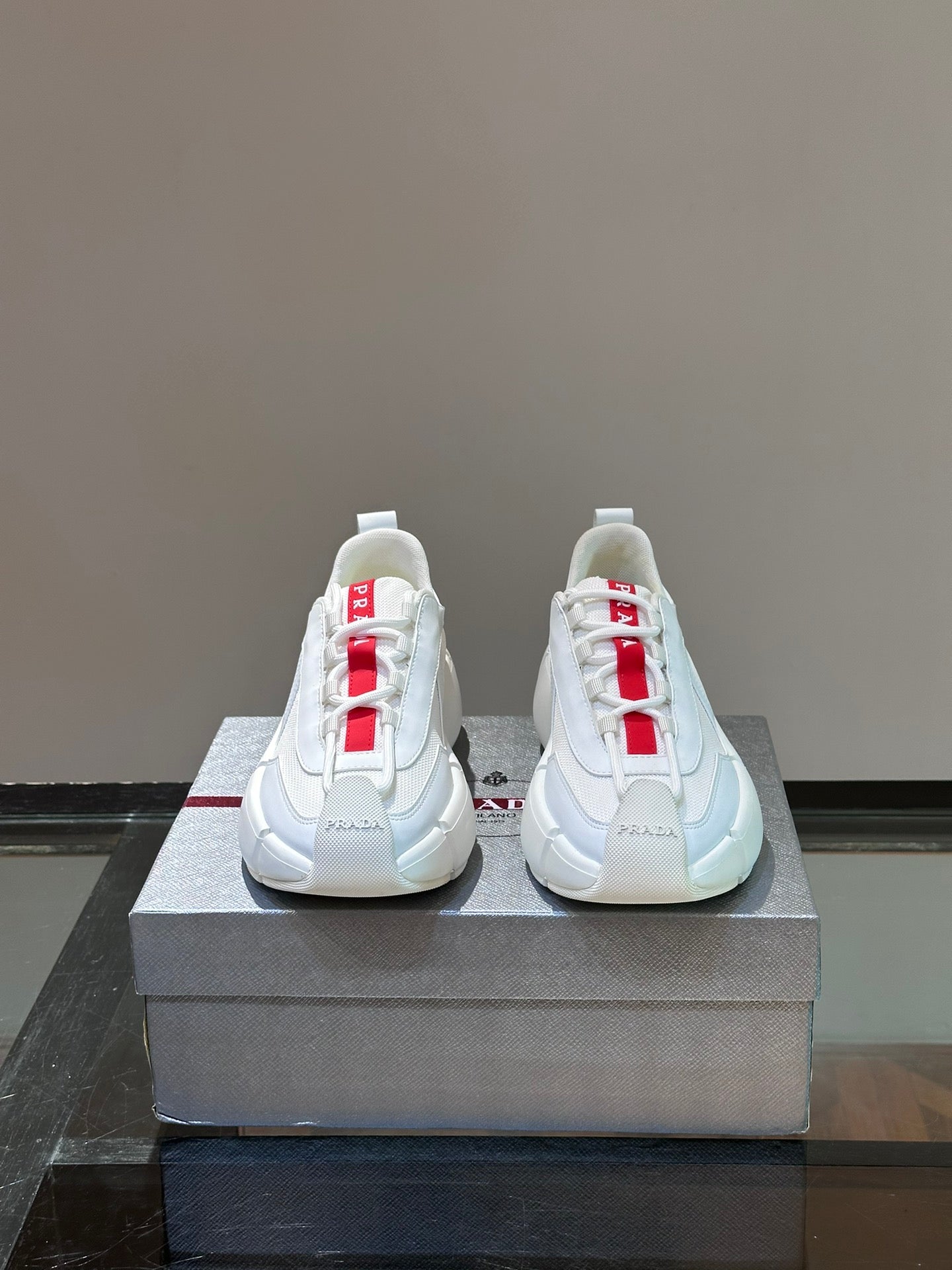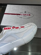 Material: Cowhide Upper with Breathable Mesh Panels, Soft and Comfortable, Breathable Tongue Decorated with PRADA Brand Letter Logo, Rubber Thick Sole with Red Tag Tongue Echo