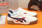 PRA SNEAKER IN WHITE CALFSKIN WITH NAVY BLUE AND RED STRIPED