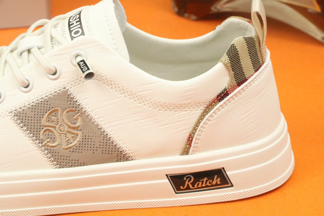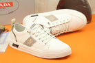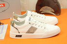 PRA TRAINER IN WHITE CALFSKIN AND TAN EMBROIDERED FABRIC