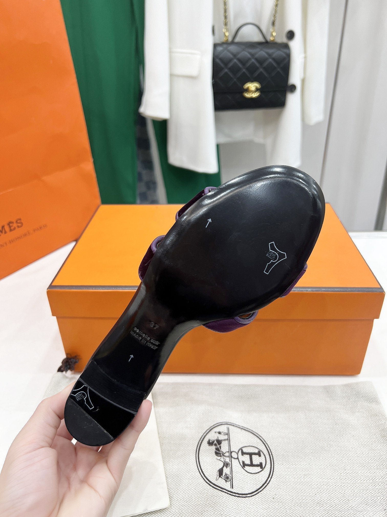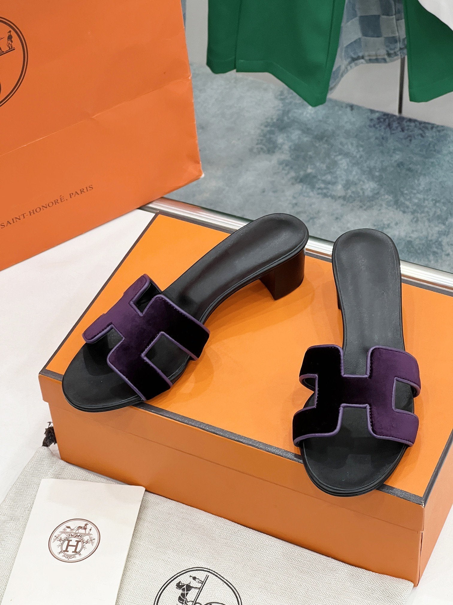 - Material: Sandal in velvet with iconic "H" cut-out.