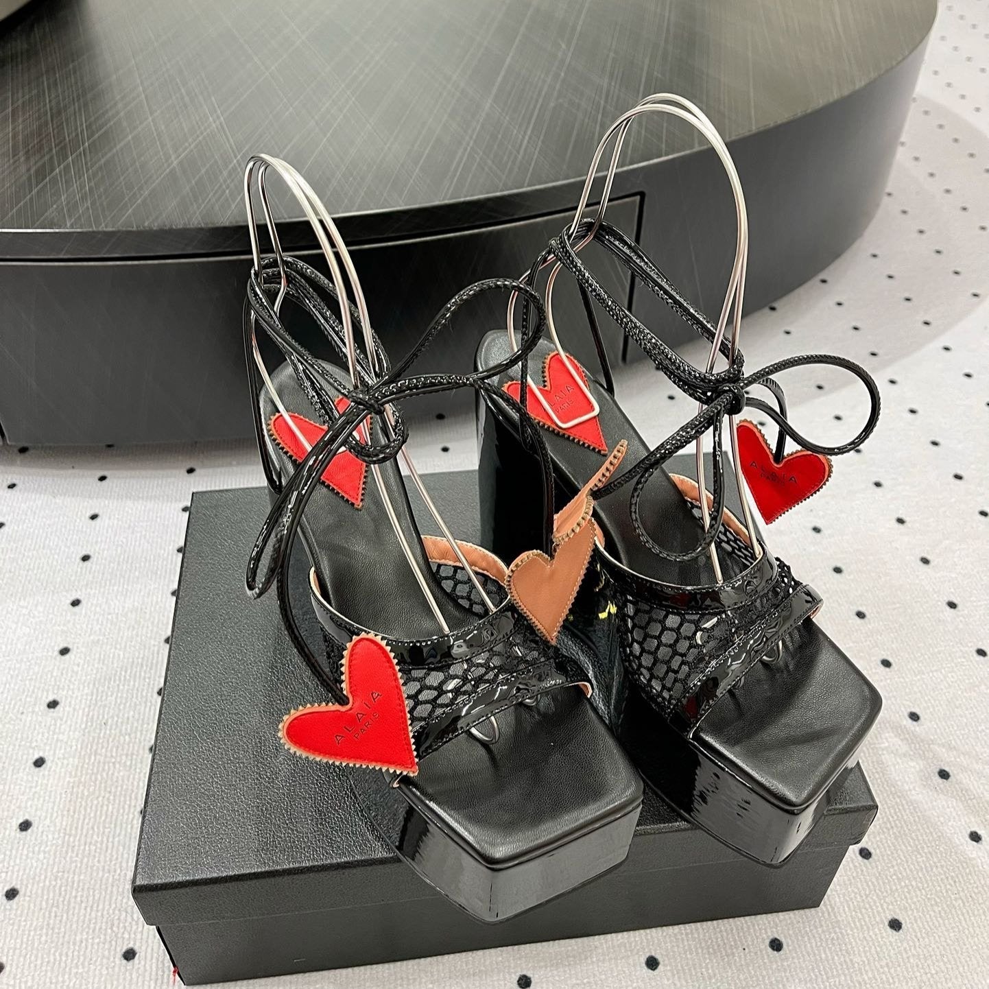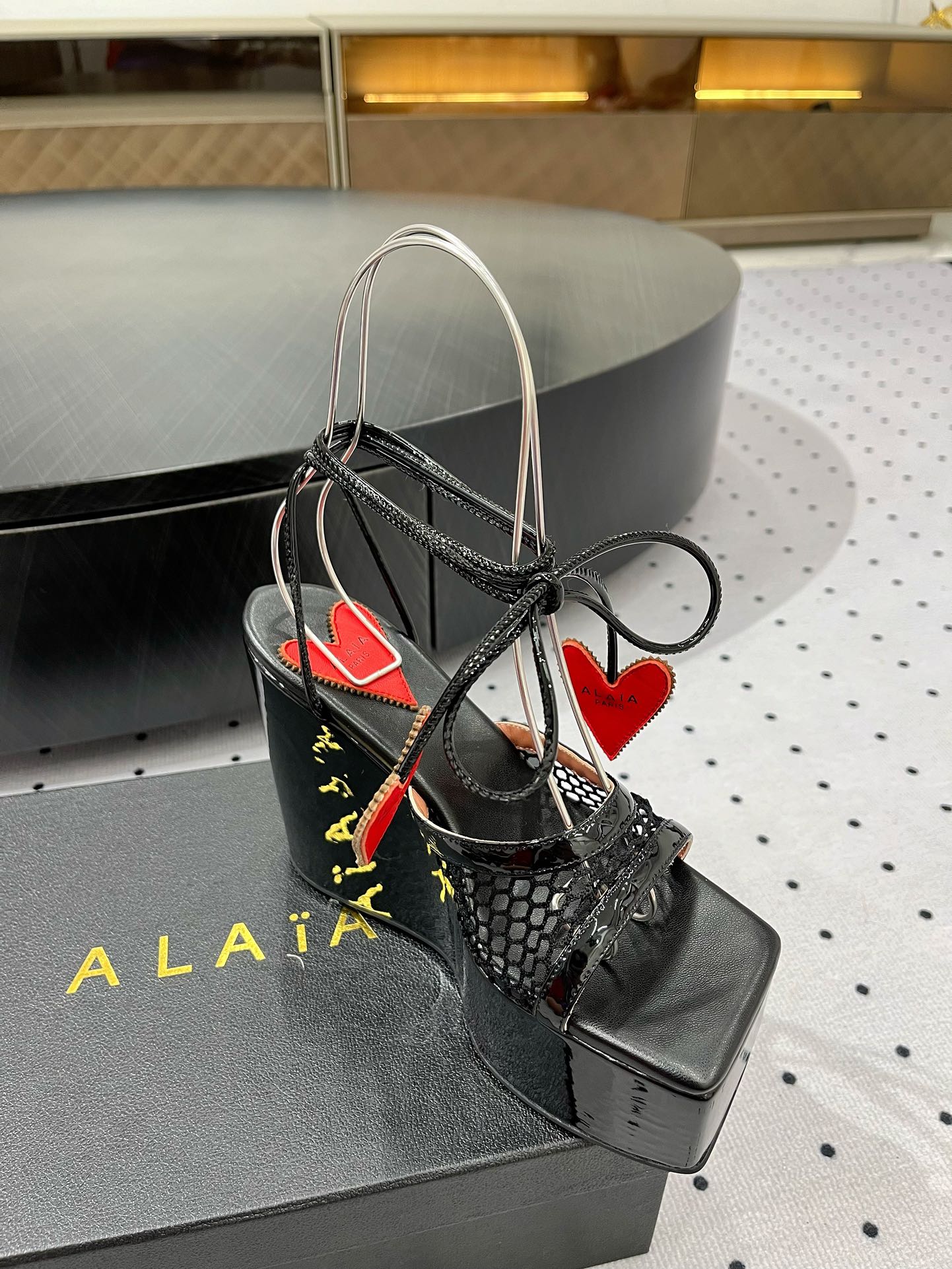 ALAIA BANQUET WEDGE SANDALS IN BLACK LAMBSKIN WITH RED HEART