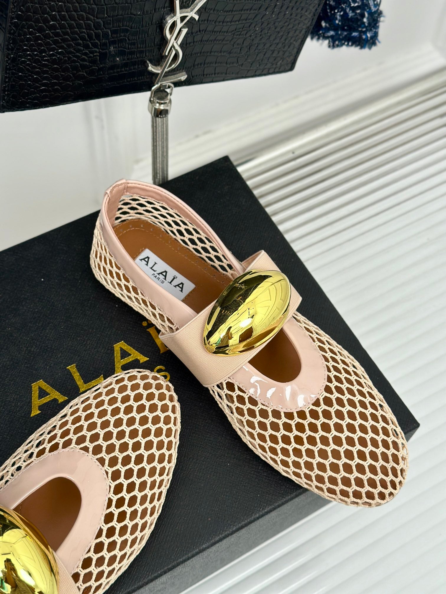 ALAIA MARY JANE SHOES IN BEIGE MESH WITH GOLD HARDWARE