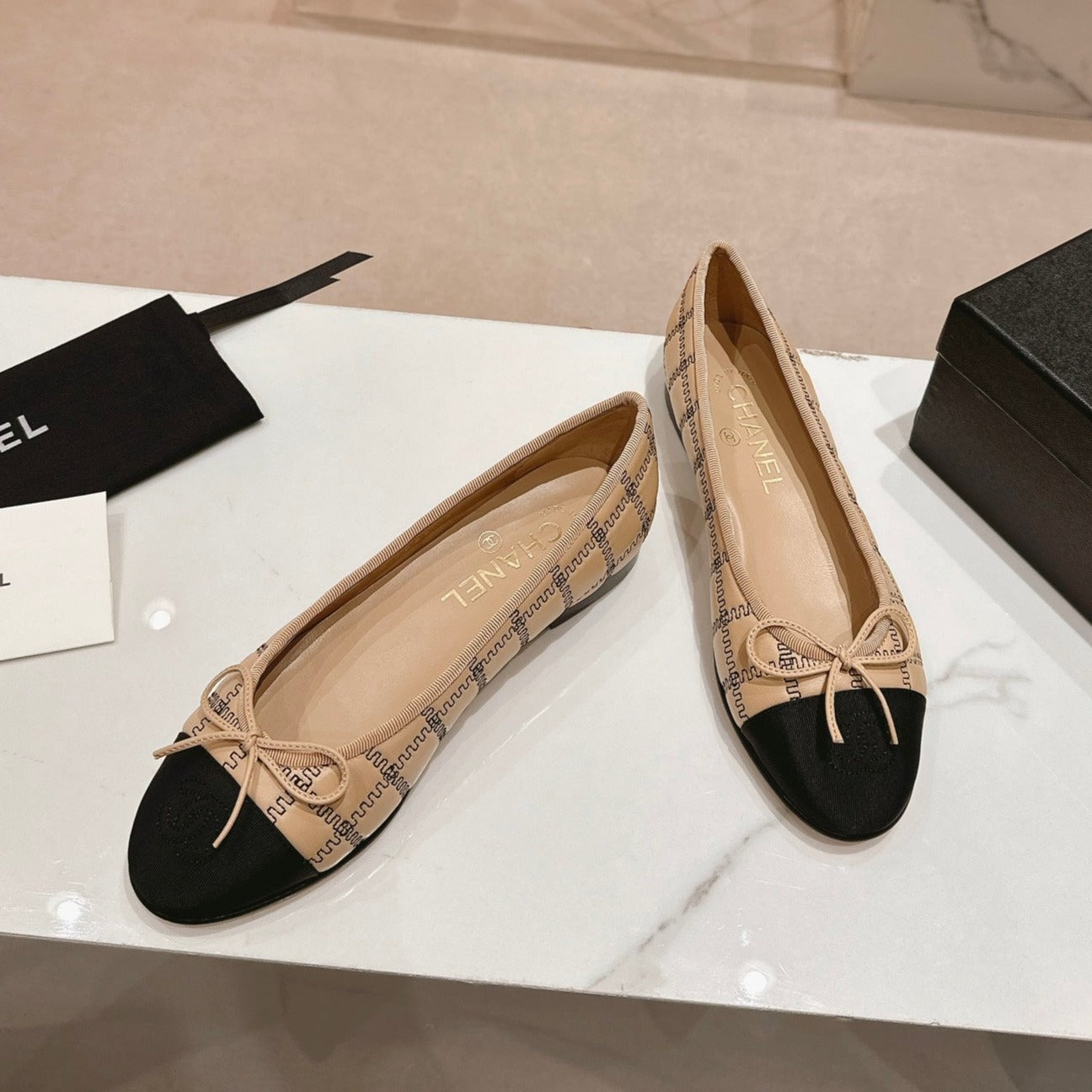 ballet flats beige black lambskin embroidery grosgrain