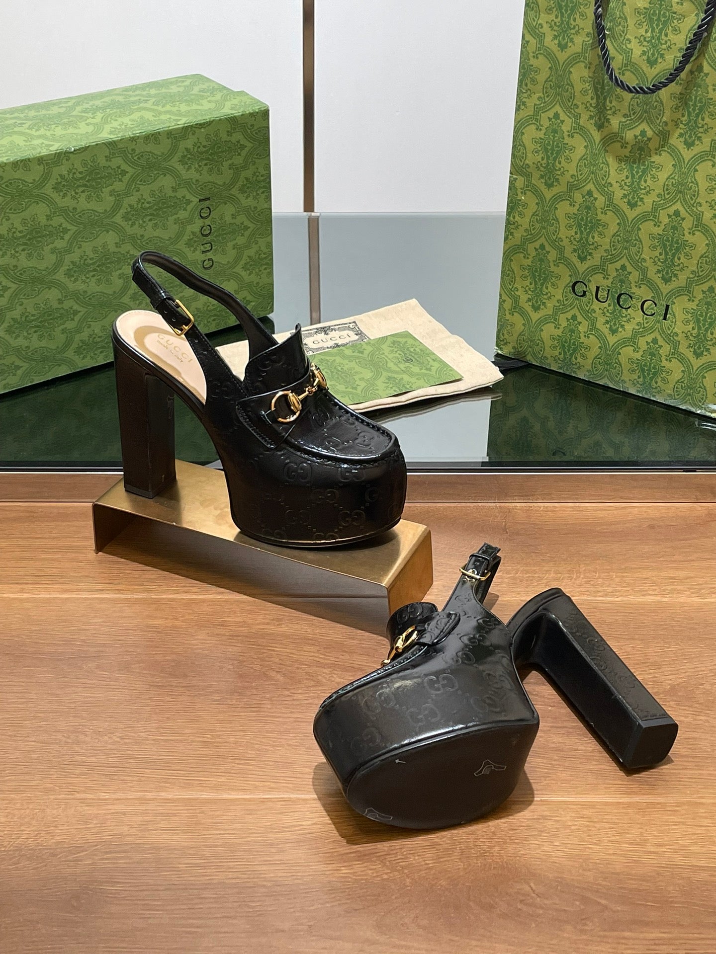 GG WOMEN'S HORSEBIT PLATFORM SLINGBACK IN BLACK EMBOSSED CALFSKIN