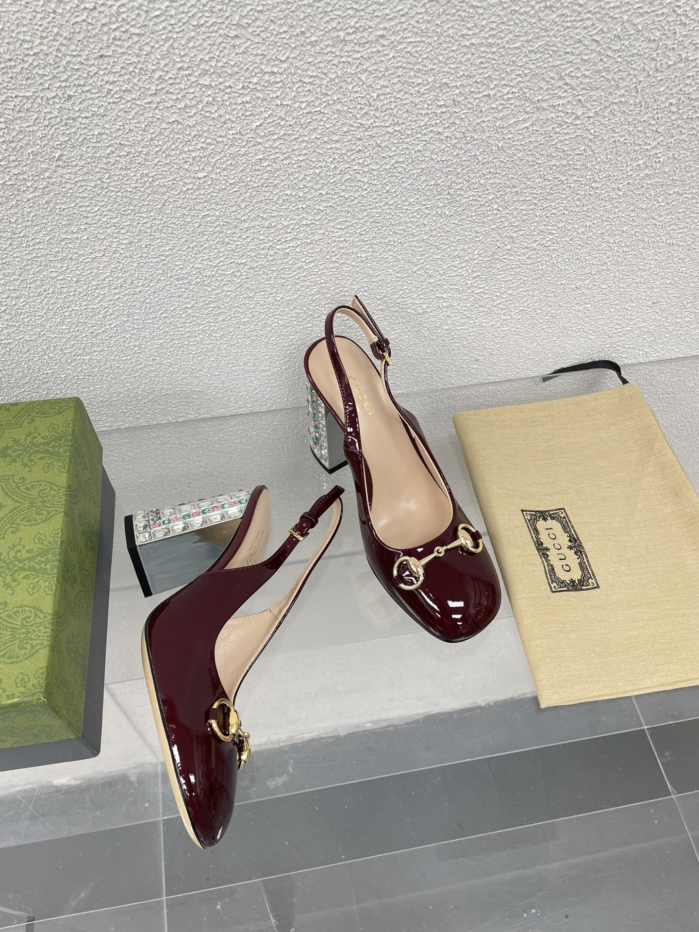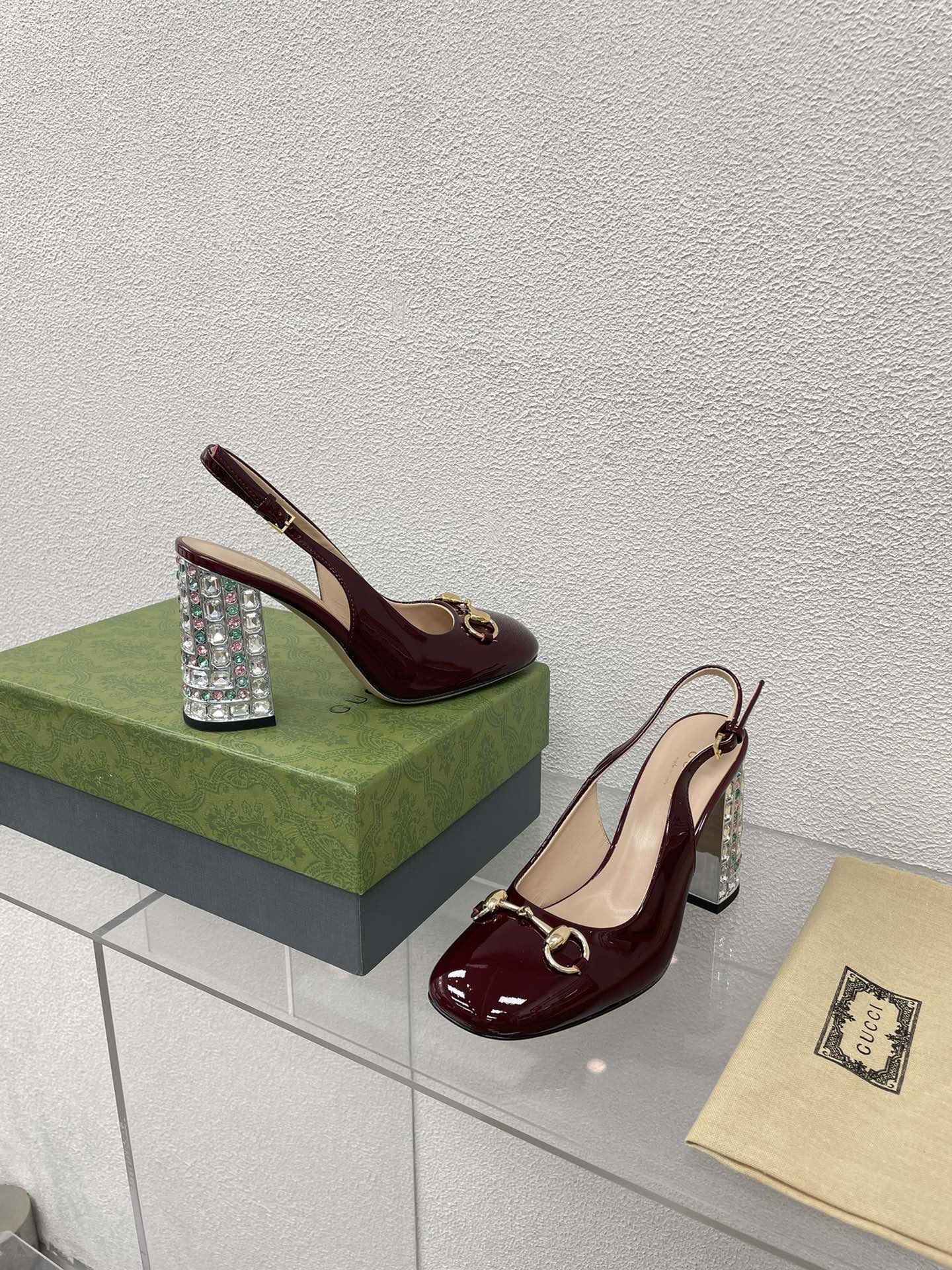 GG WOMEN'S HORSEBIT SLINGBACK 95MM IN WINE RED CALFSKIN WITH RHINSTONES