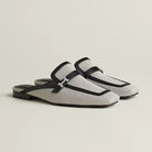 • Material: Mule in H canvas and calfskin with miniature permabrass-plated Paris buckle and contrasting piping.