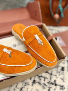 Loro Piana Carrot White Suede Charms Walk Flat Mules
