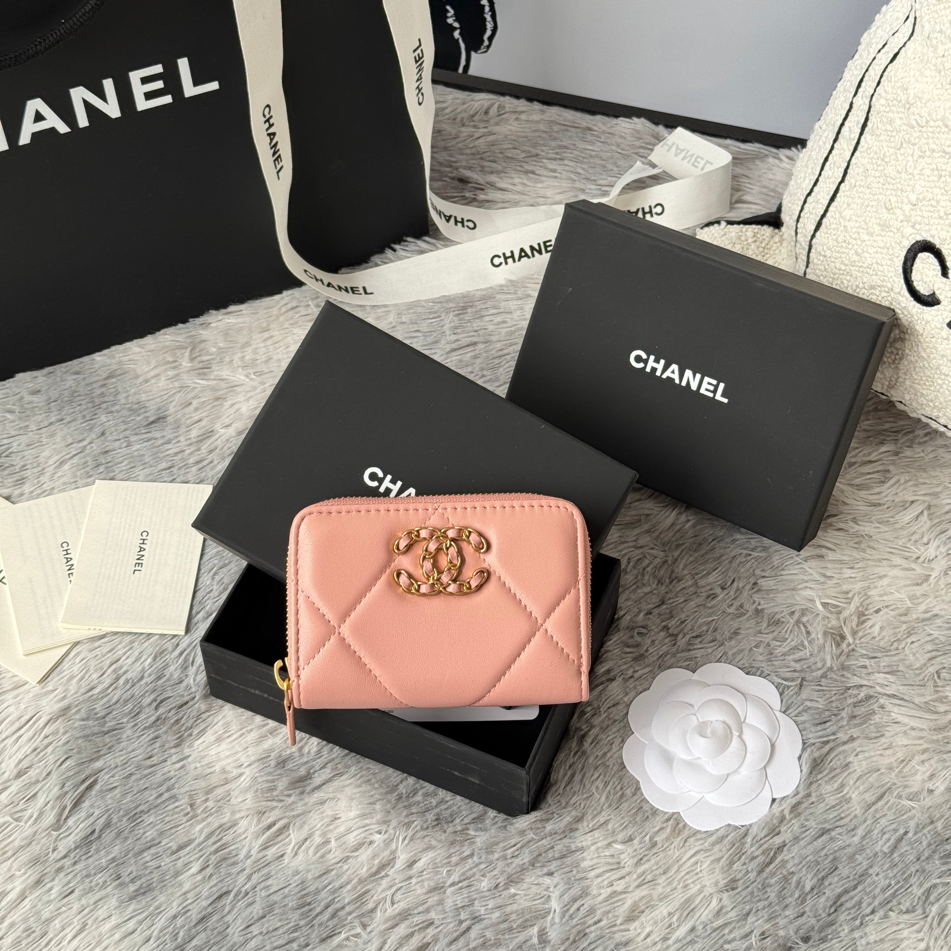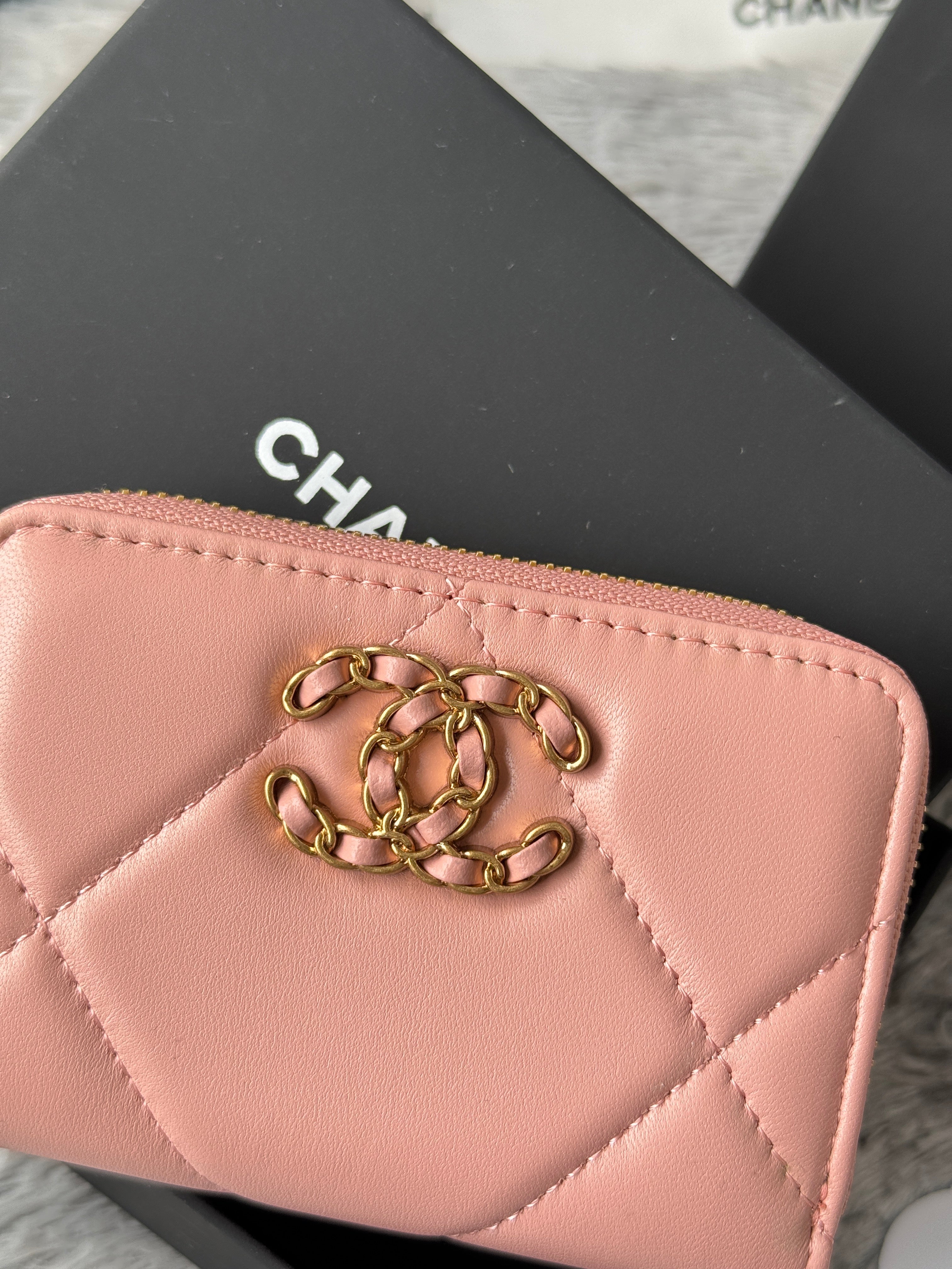 CC 19 Quilted Zipper Coin Purse Pink Gold-Tone Sheepskin 242796