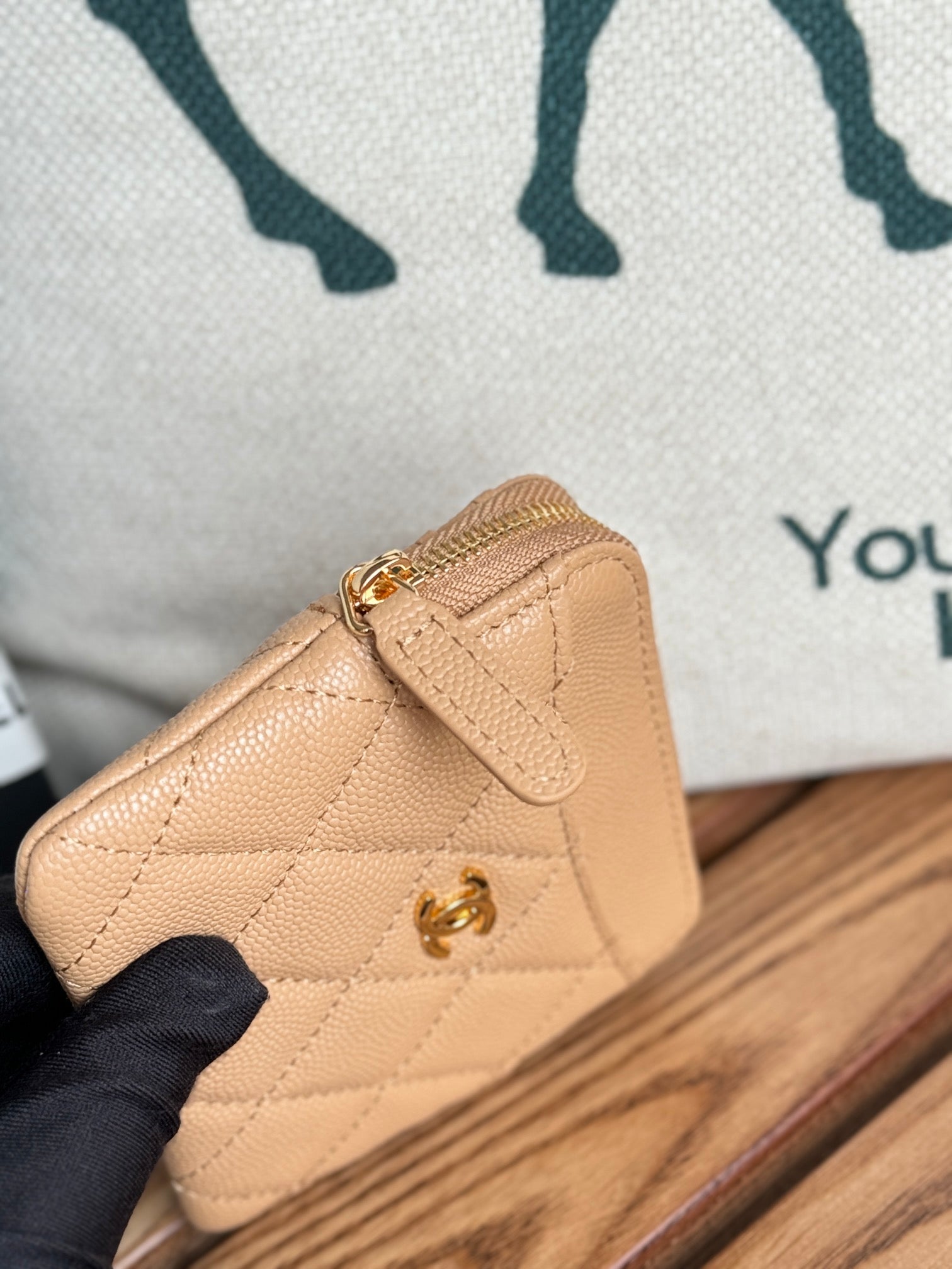 CC Zip Card Holder Wallet Beige Gold Metal Caviar 240603