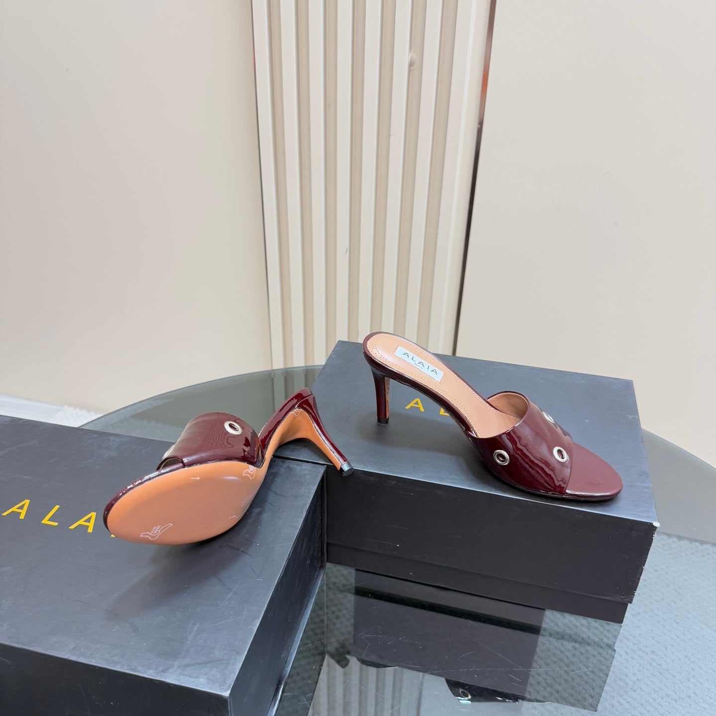 Alaia 2025 Oeillets Embellished Leather Sandals Glossy Black Lambskin 299668