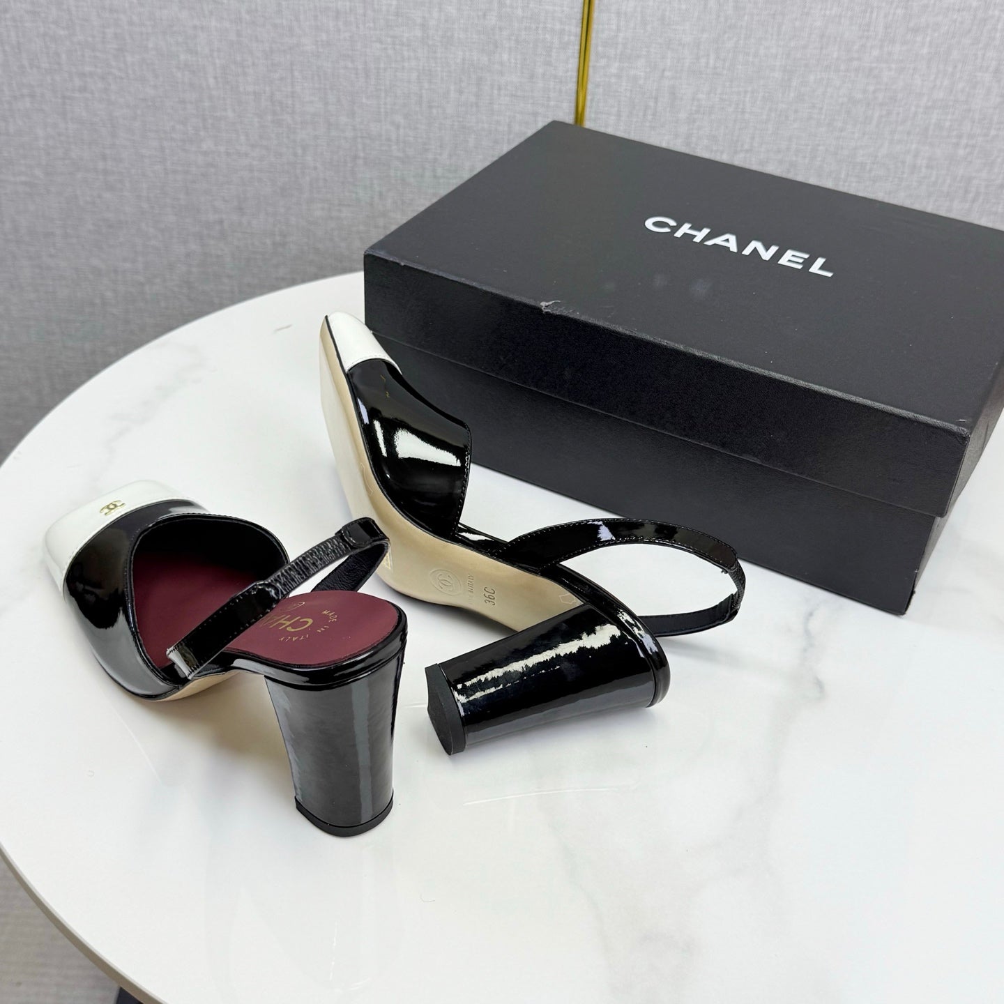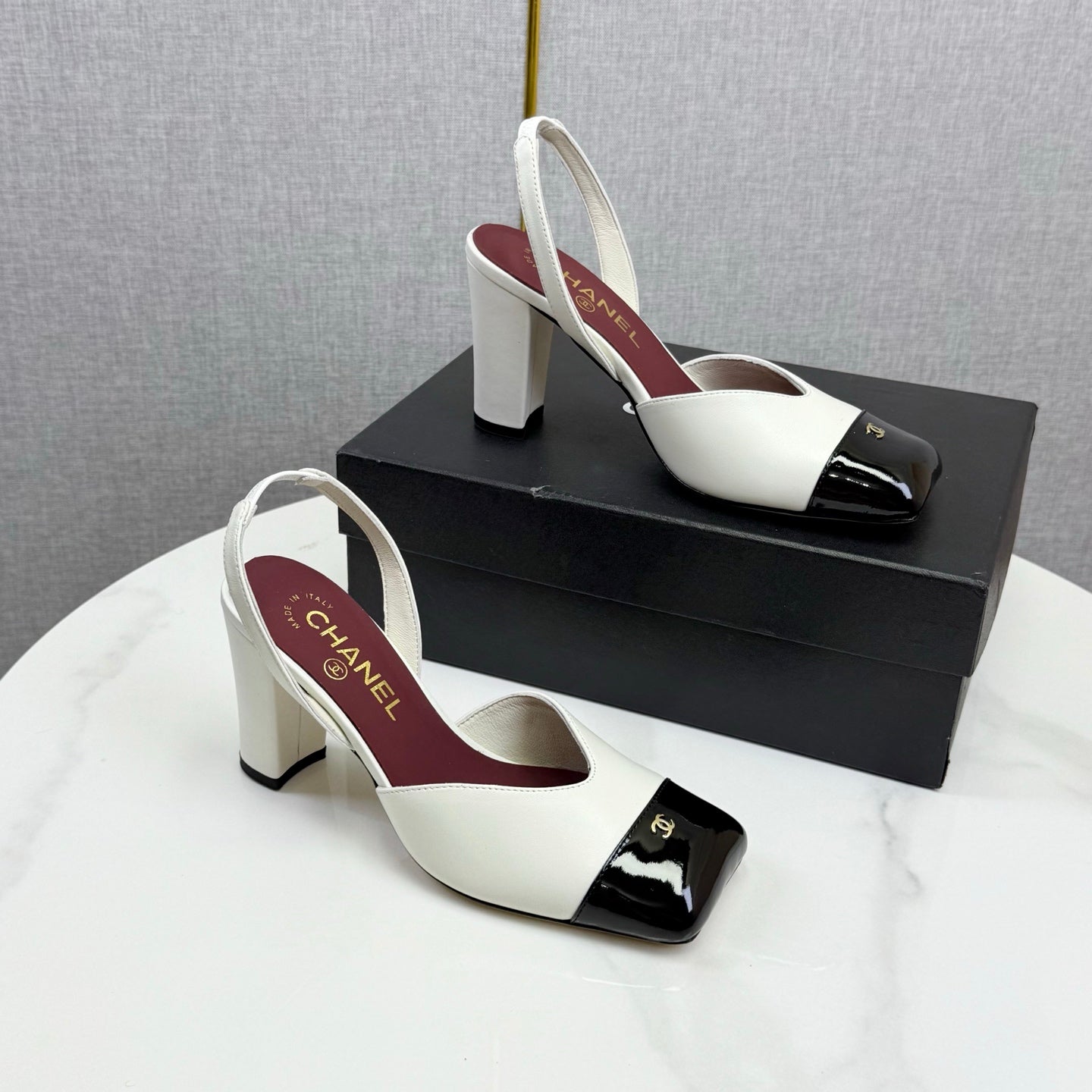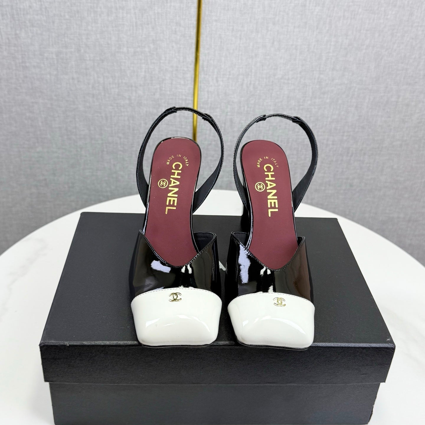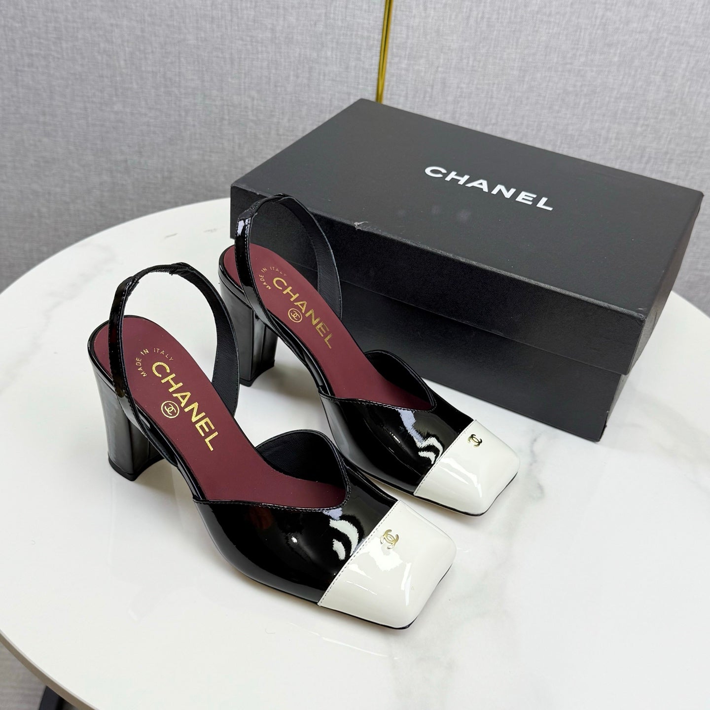 CC 25FW Square Toe Slingback Black White Patent Leather 541133