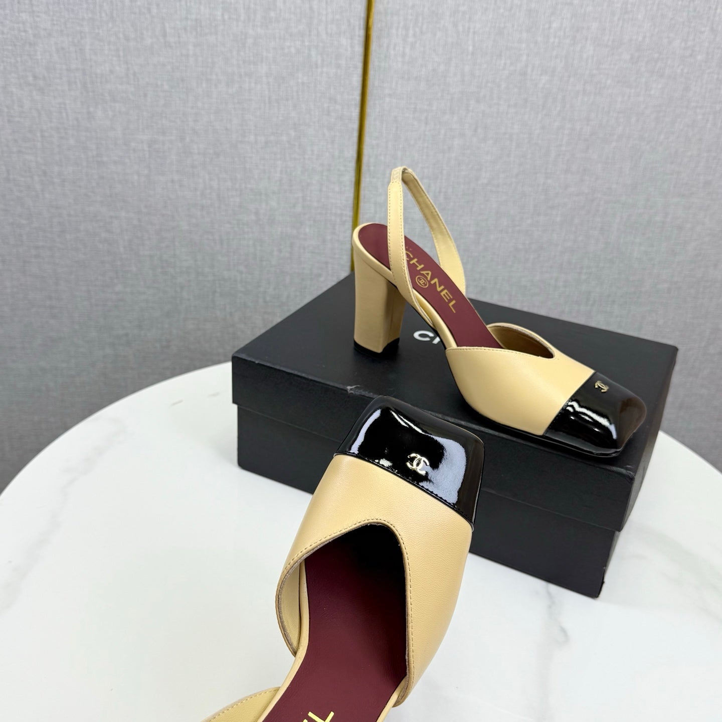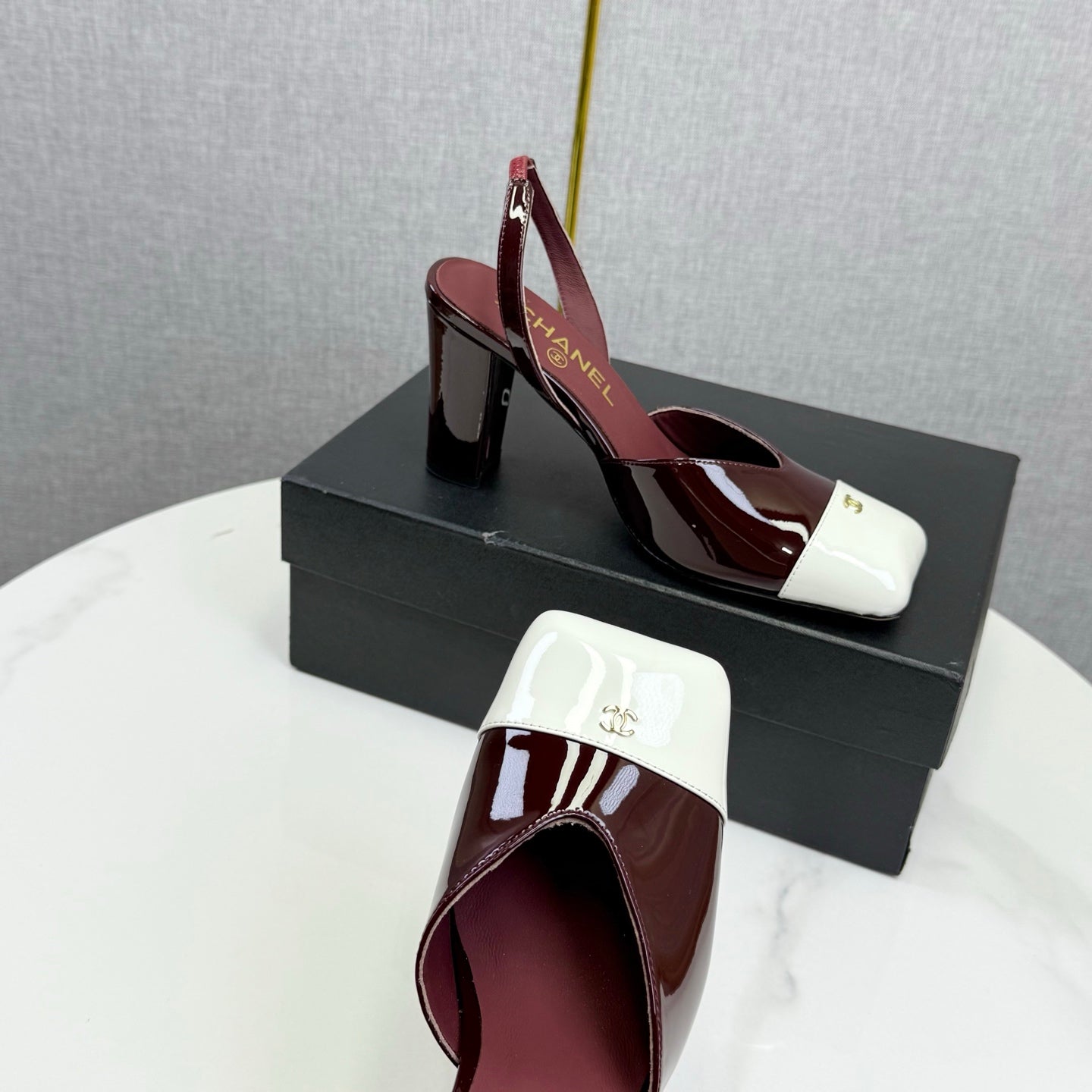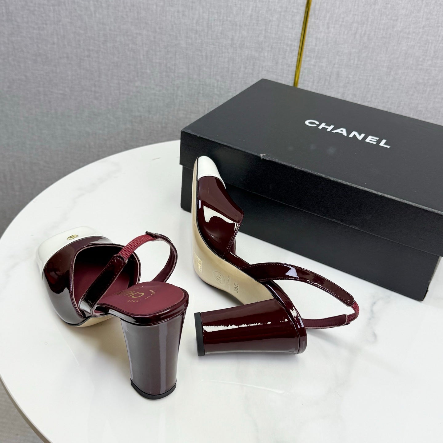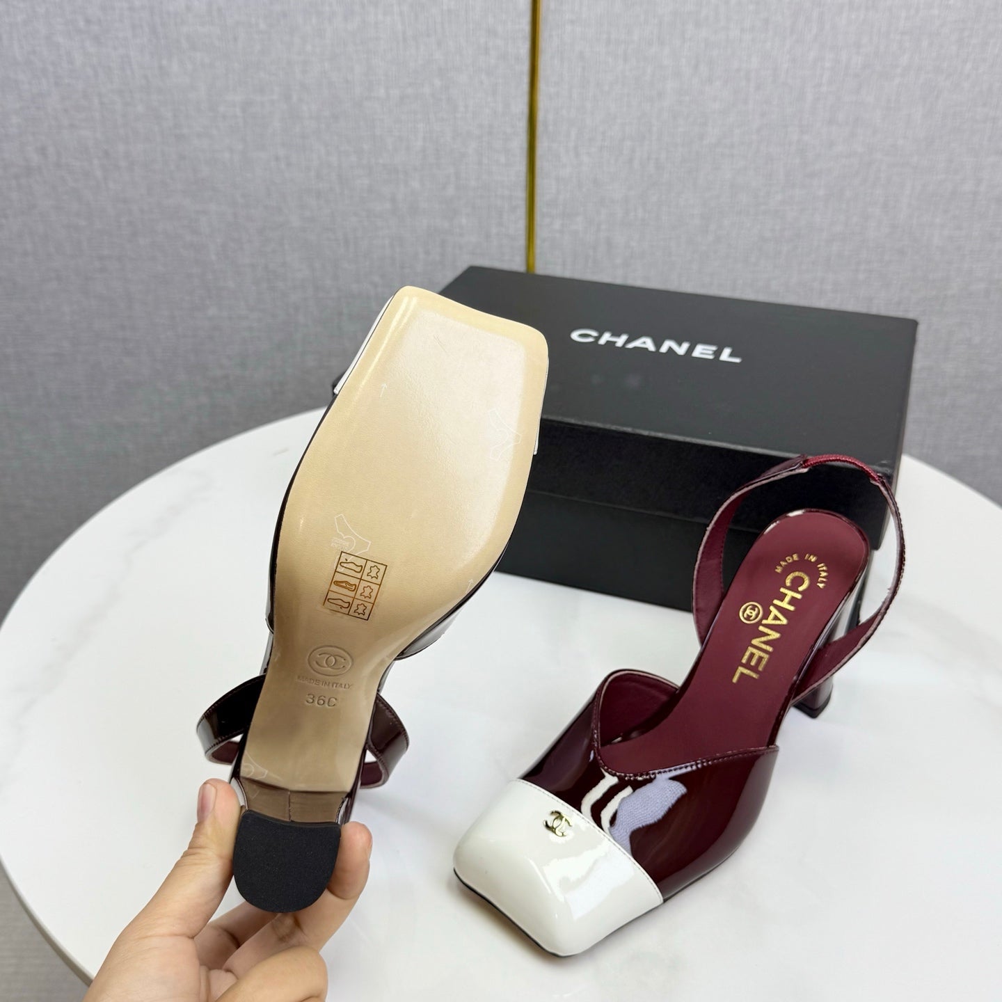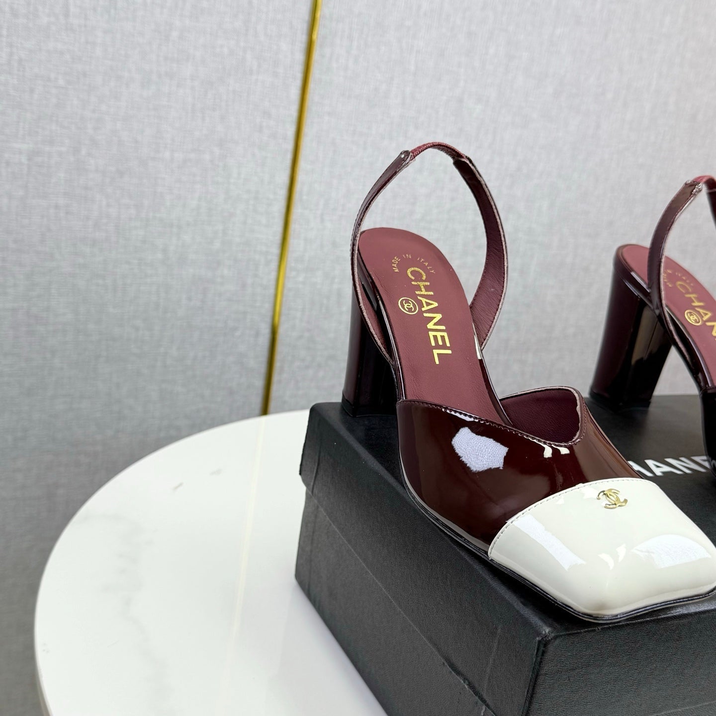CC 25FW Square Toe Slingback White Dark Burgundy Patent Leather 541136