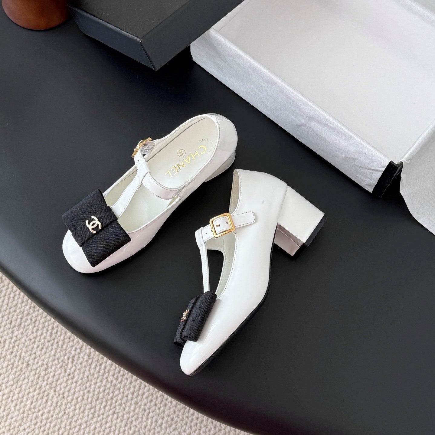 CC 25FW Square Toe Slingback Black White Sheepskin Patent Leather 541132