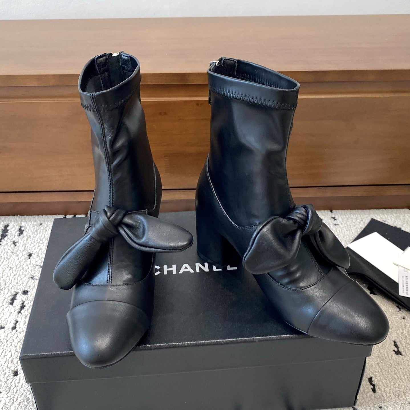 CC Big Ribbon Middle Boots Heel 50mm Black Beige Sheepskin Patent Leather 529279