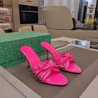 BOW-EMBELLISHED HIGH MULES IN HOT PINK SHEEPSKIN