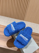 FURRY SLIDES IN COBALT BLUE CURLY SHEARLING