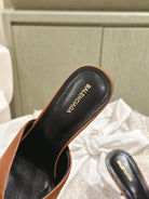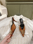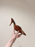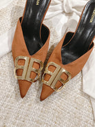 POINTED BB GOLD BUCKLE HIGH MULES IN BROWN RUST SILK
