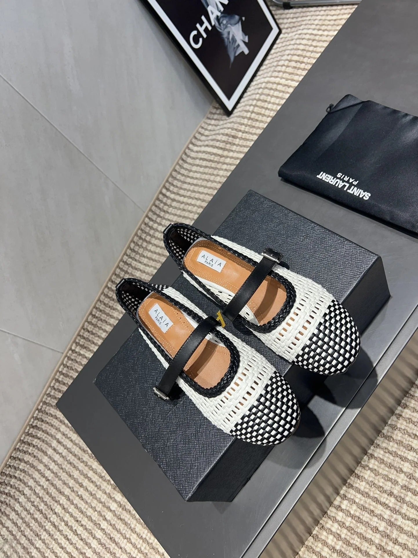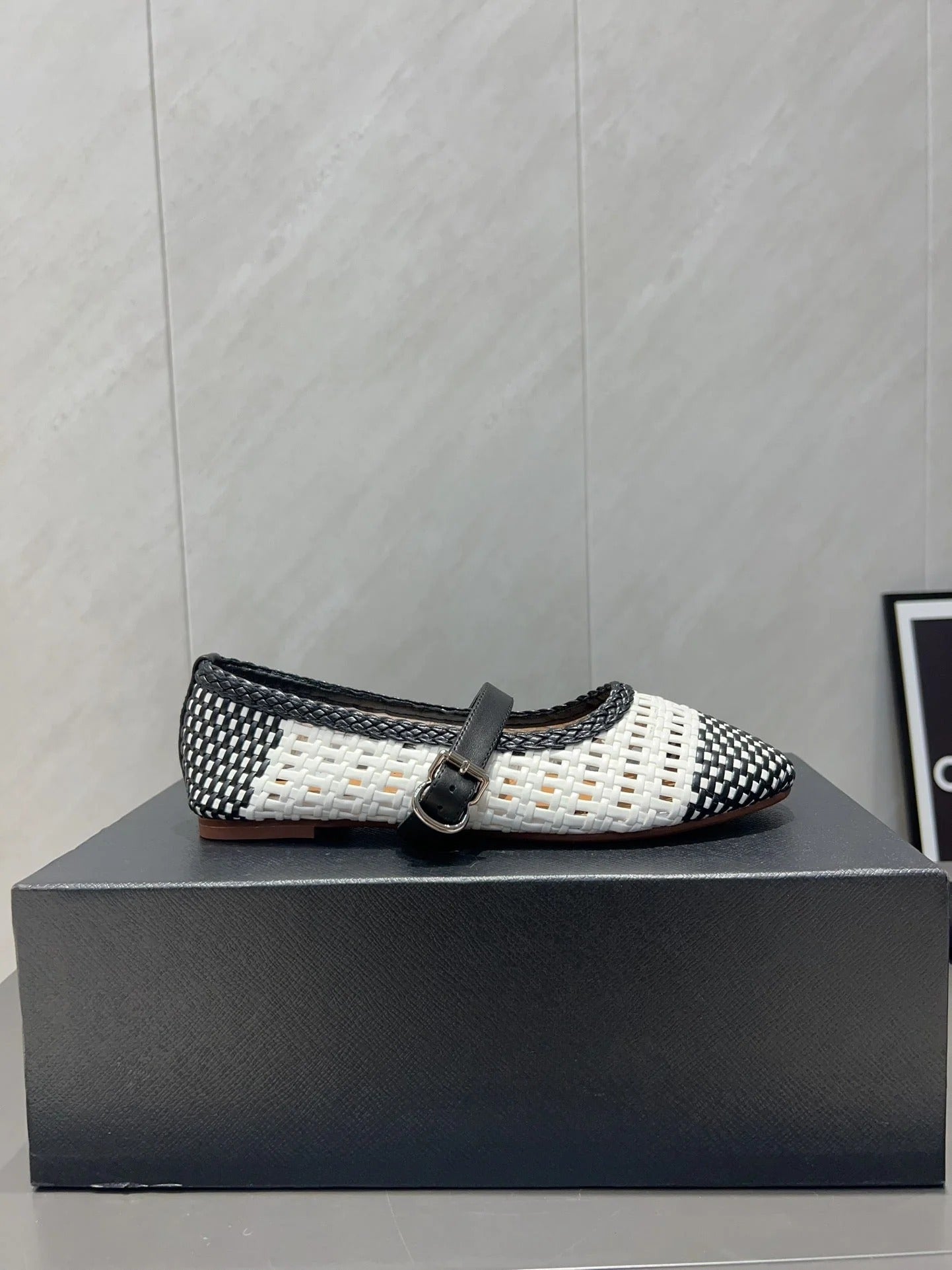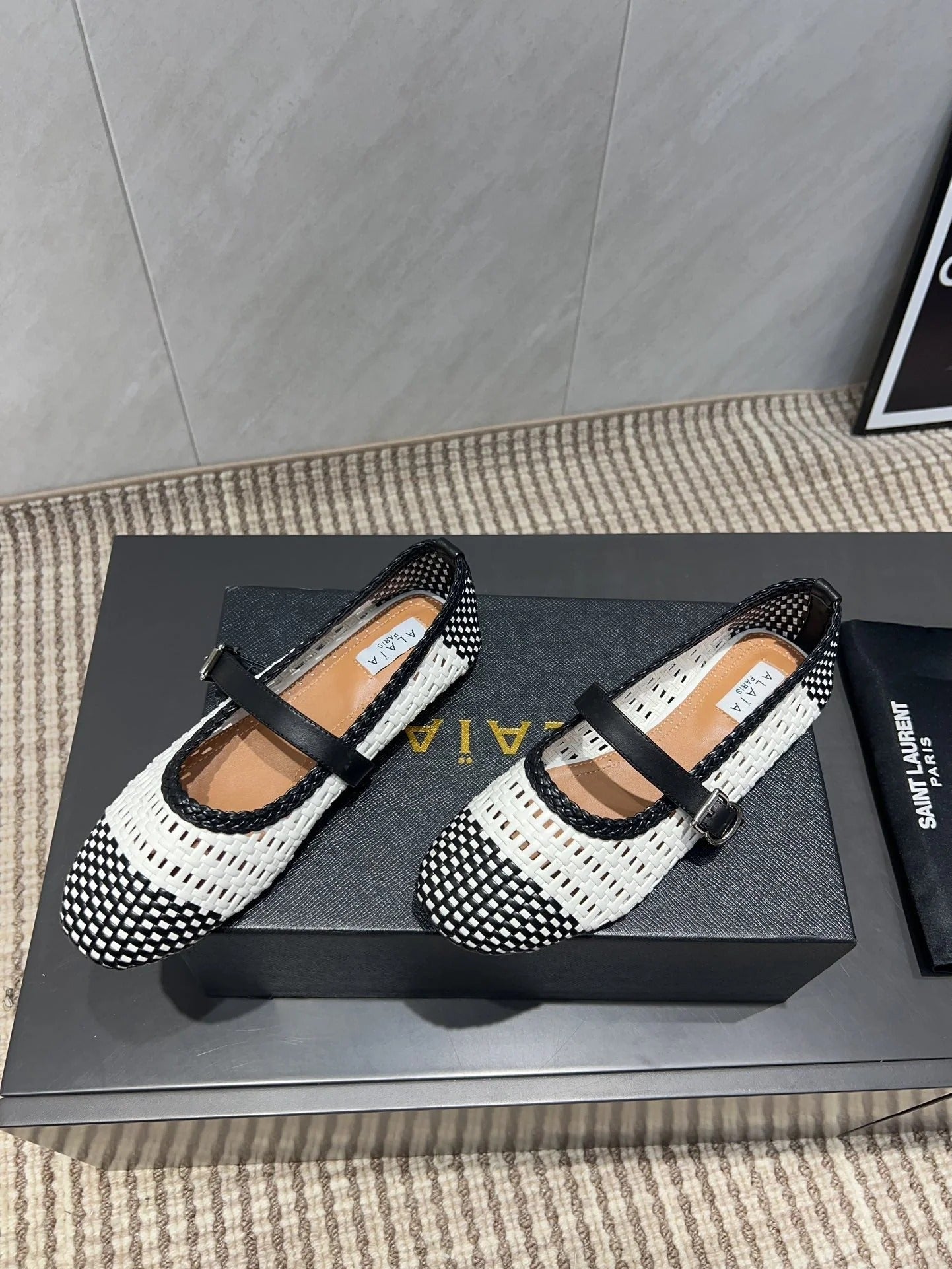 Alaia Mary Jane Flats Woven Pattern 25s In White Mix Black Calfskin