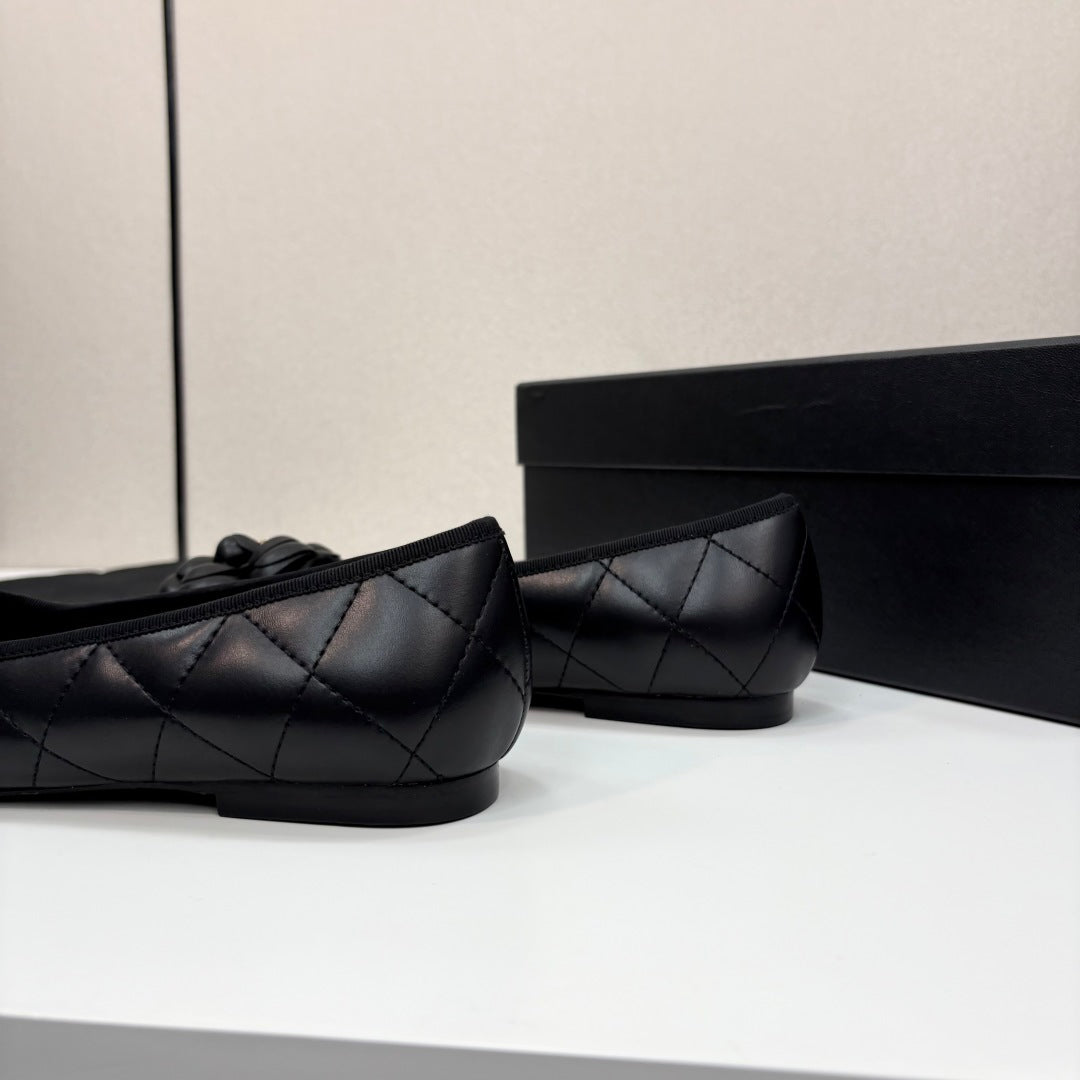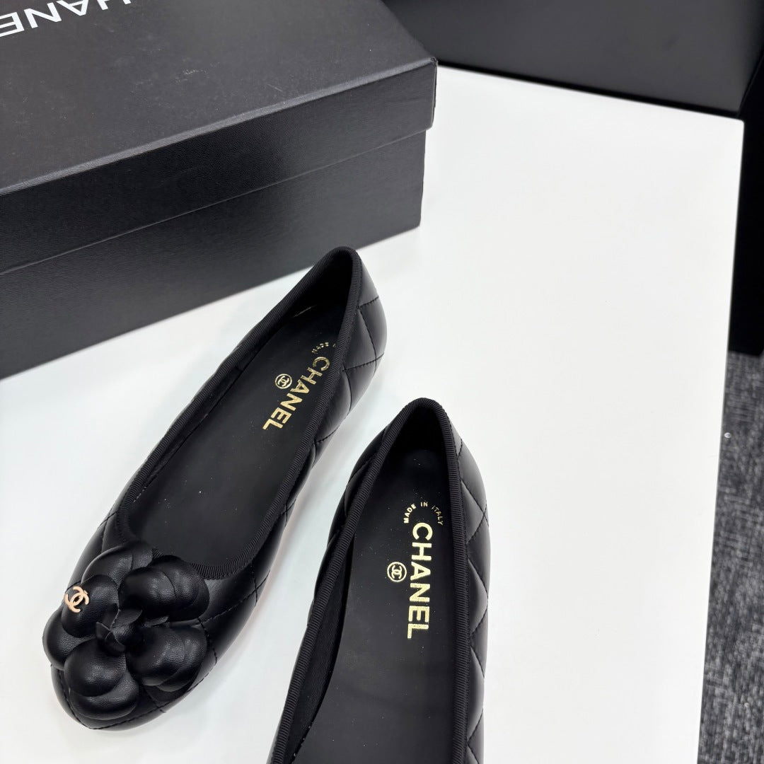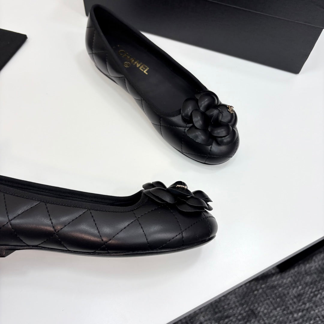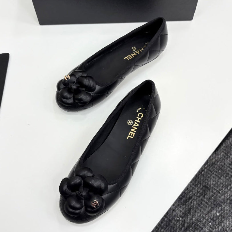 CC 25 Ballet Flat Flower Black Quilted Calfskin