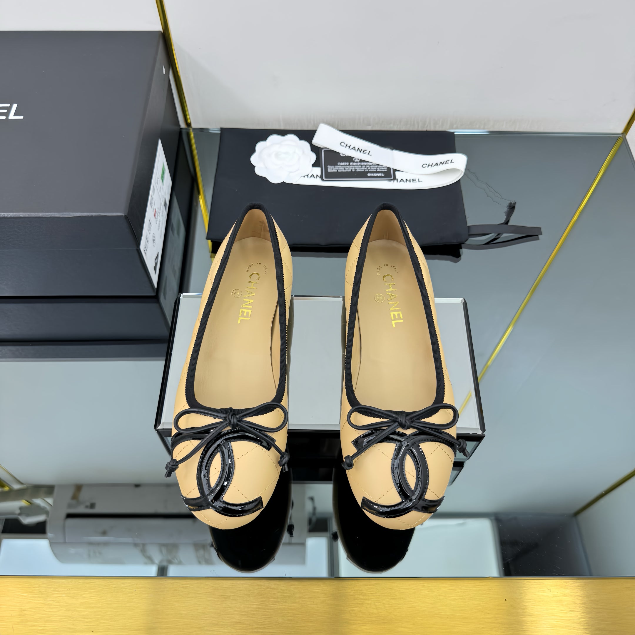 CC 25 Cambon Ballet Flat Beige Black Quilted Calfskin