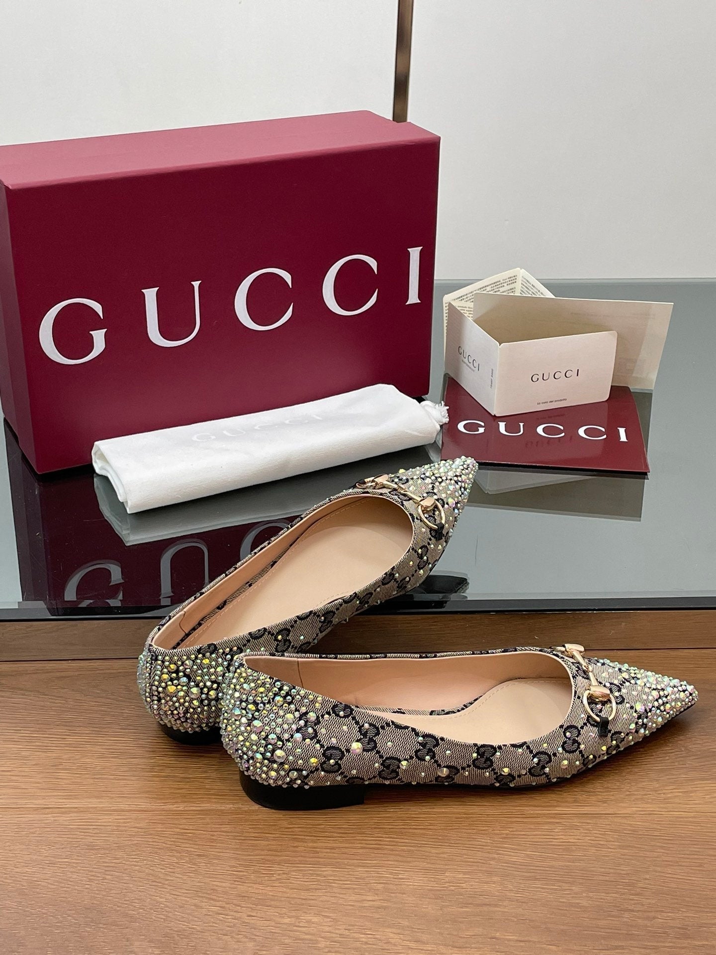 GG Horsebit Ballet Flat Beige Black Monogram Canvas Crystal-Embellished