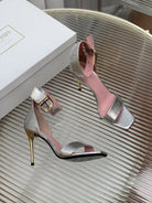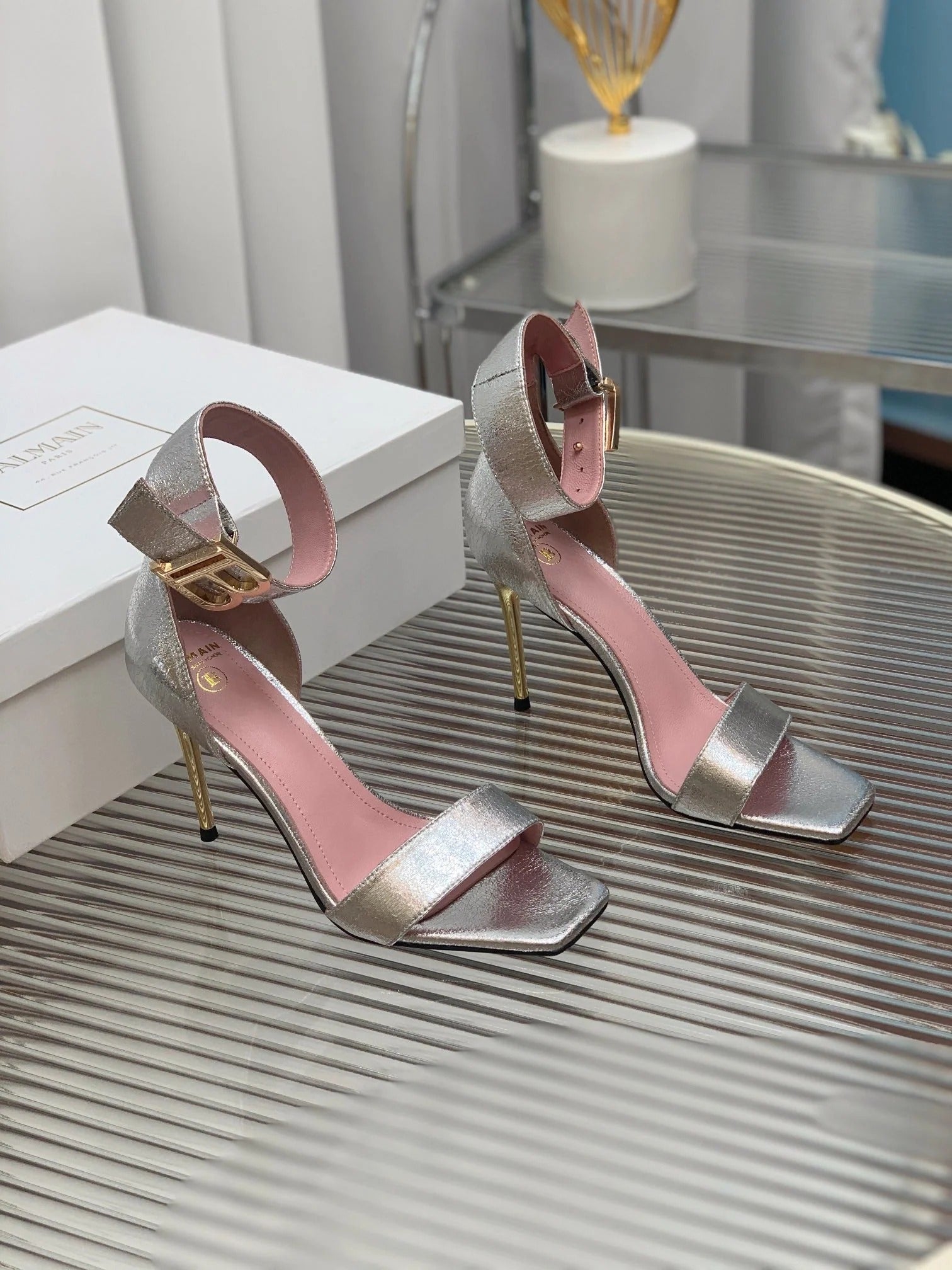 BALMAIN 25S B STRAP HIGH HEEL SANDALS 95MM IN SILVER CALFSKIN