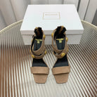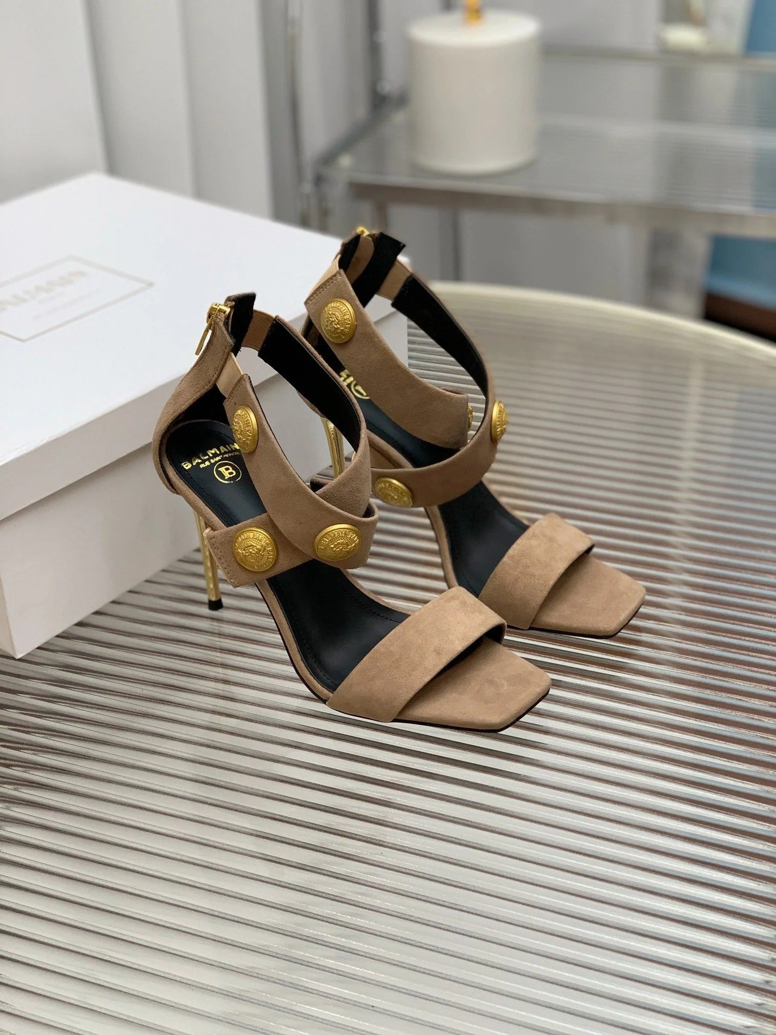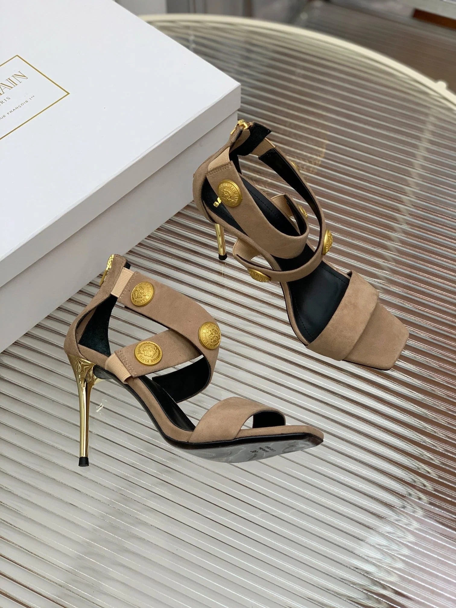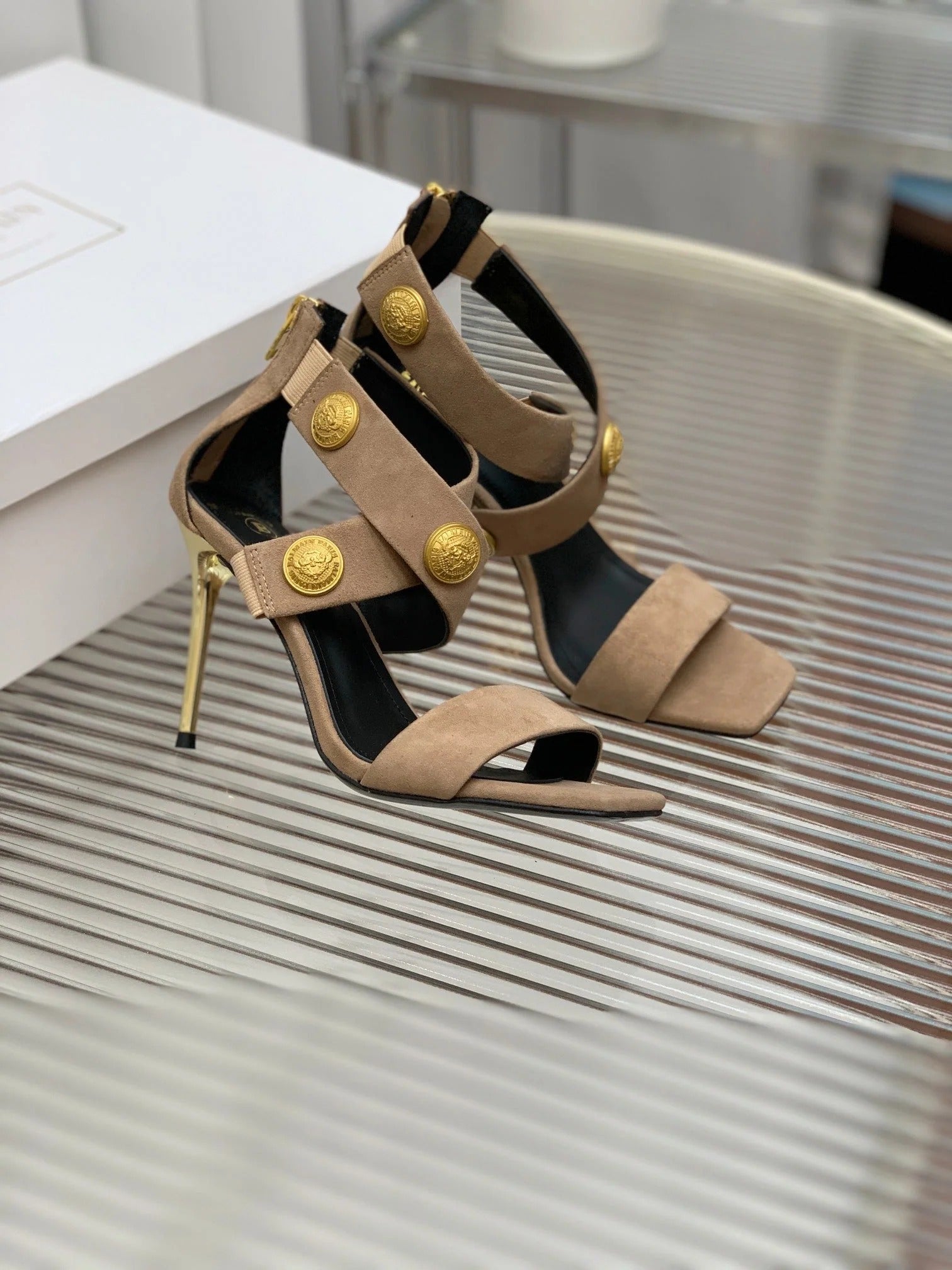 BALMAIN 25S CROSSOVER STRAP HIGH HEELS 95MM IN LIGHT BROWN SUEDE