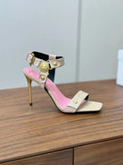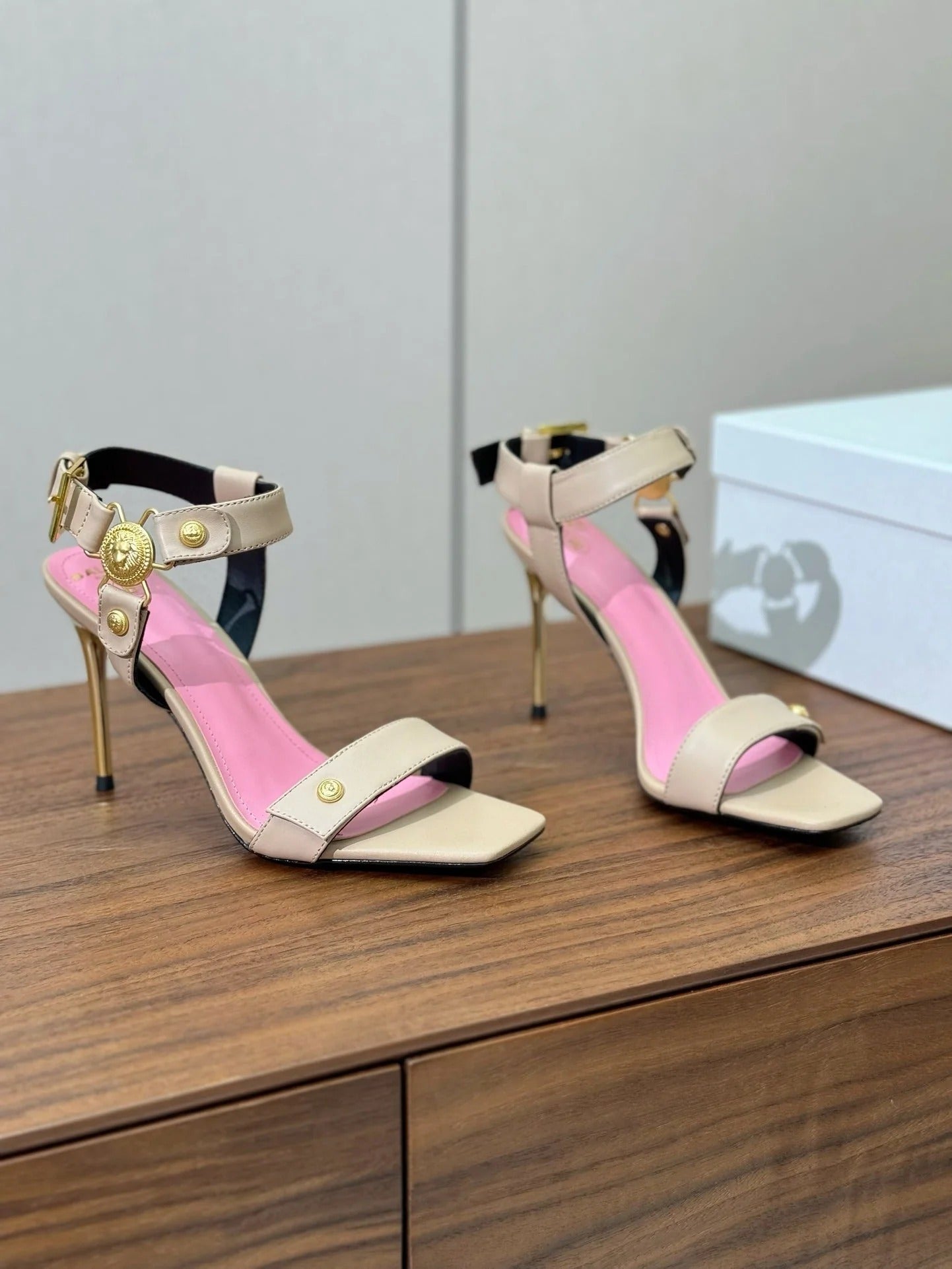 BALMAIN 25S HEELED EVA SANDALS 95MM IN BEIGE AND PINK CALFSKIN