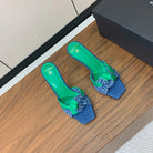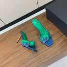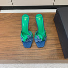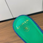 BALMAIN 25S HIGH HEEL MULES 95MM IN EMERALD GREEN DENIM AND CALFSKIN
