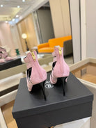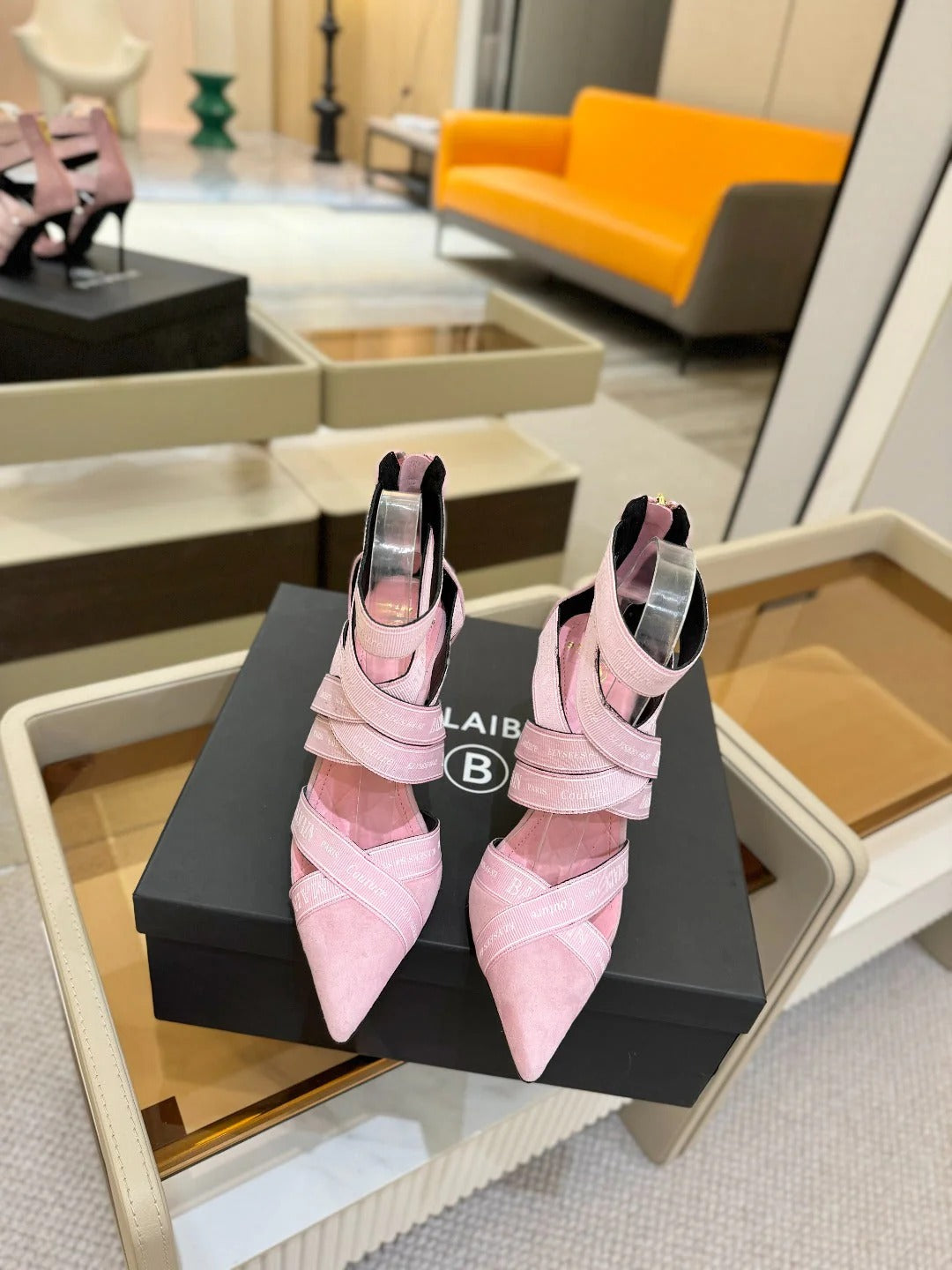 BALMAIN 25S HIGH HEELS LOGO RIBBON 95MM IN PINK SUEDE