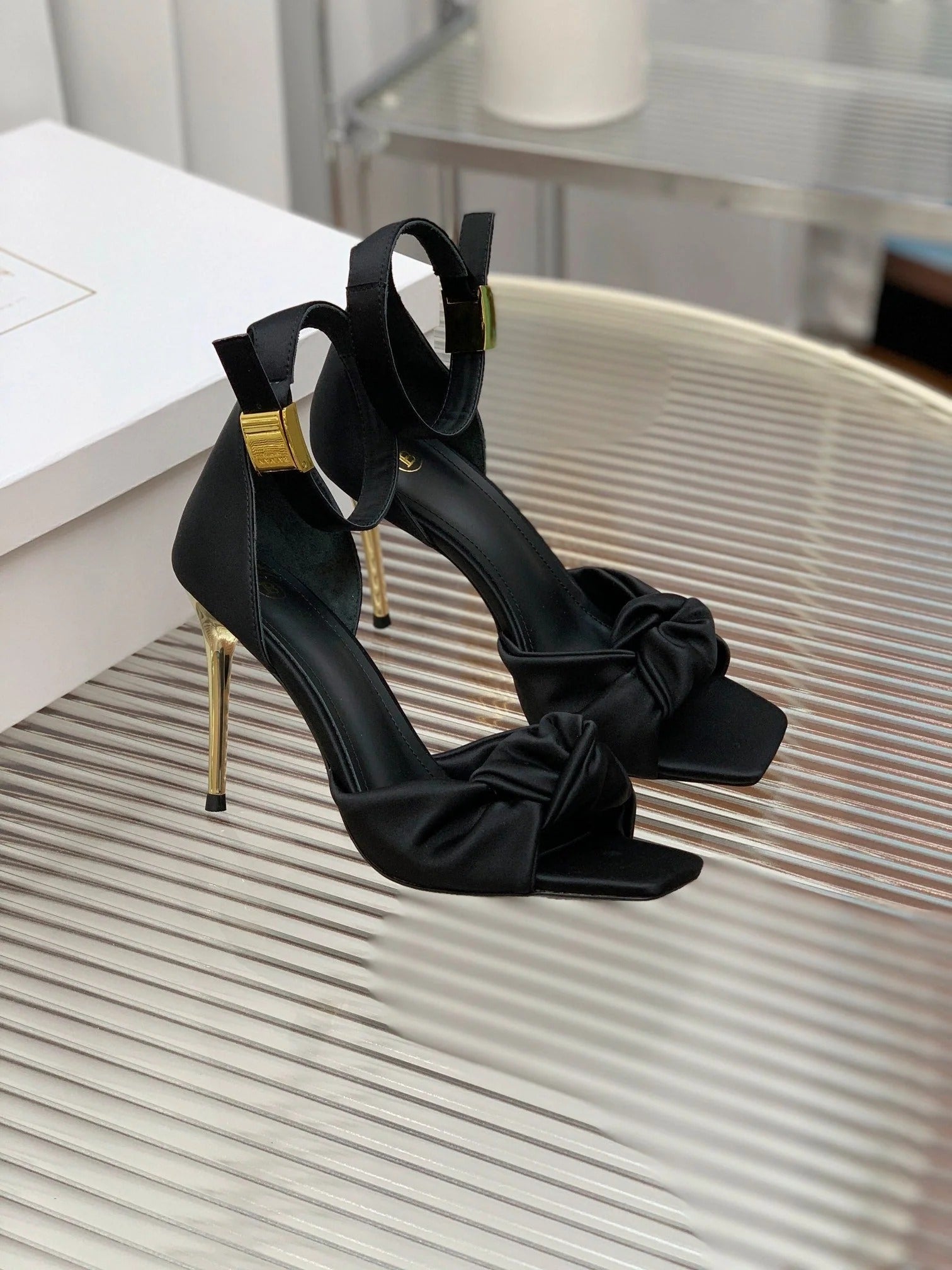 BALMAIN 25S KNOTTED HIGH HEELS 95MM IN BLACK SATIN
