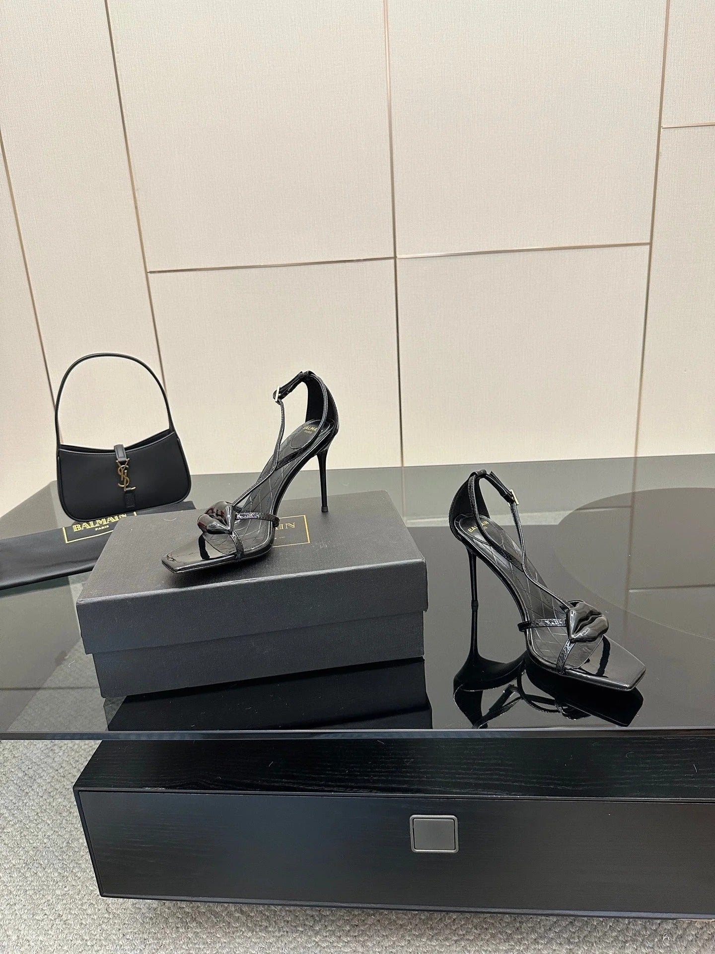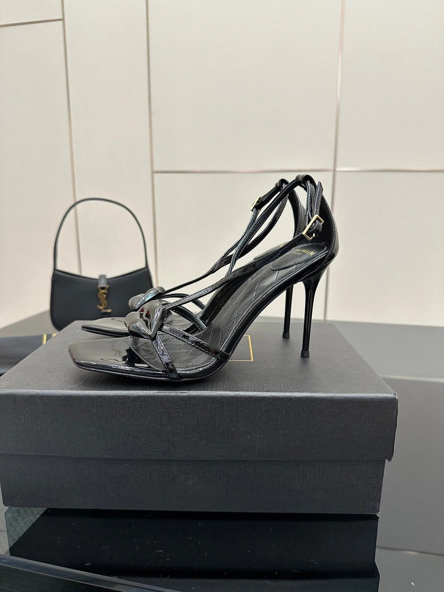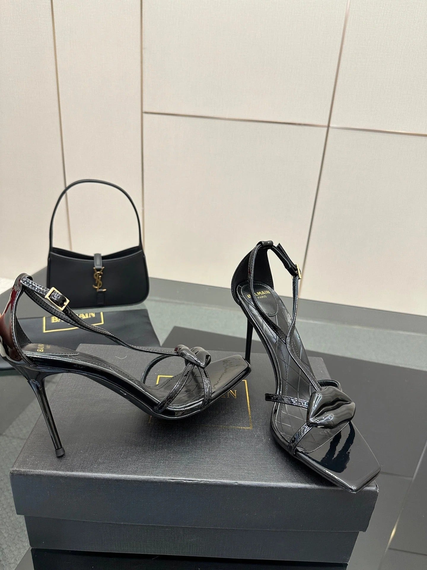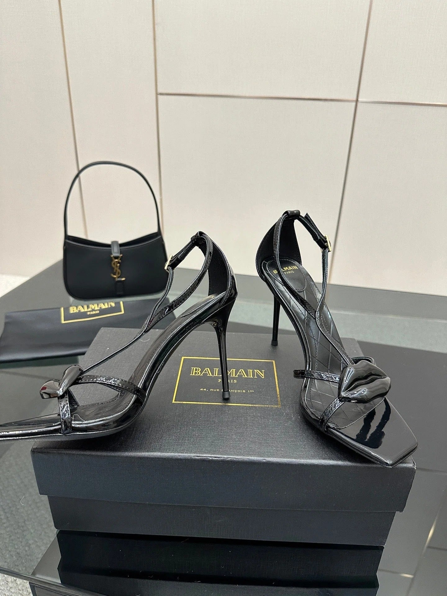 BALMAIN 25S LIPS SANDALS 10 IN BLACK SATIN