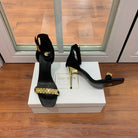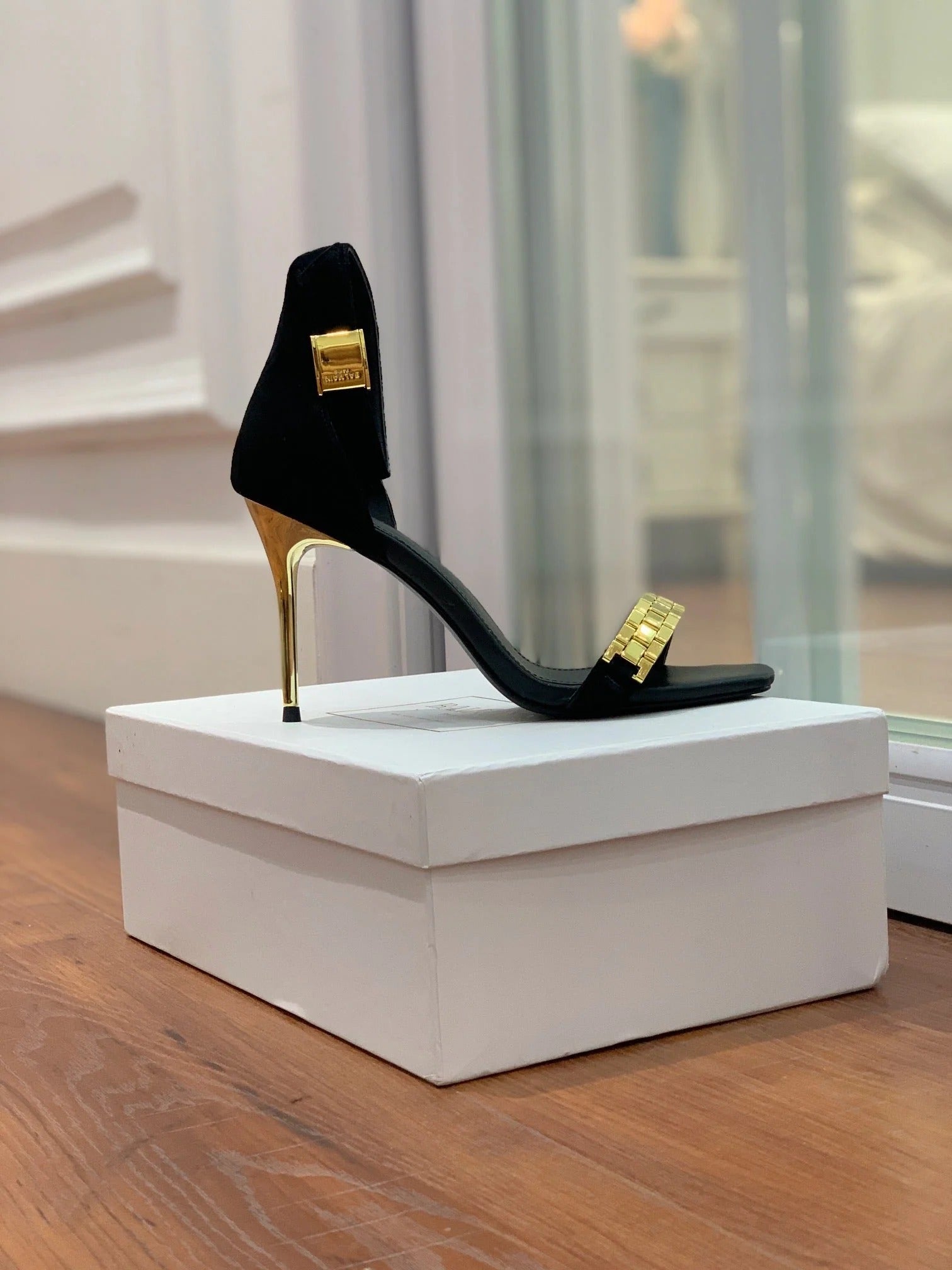BALMAIN 25S METAL STRAP HIGH HEELS 95MM IN BLACK SUEDE GOLD HARDWARE