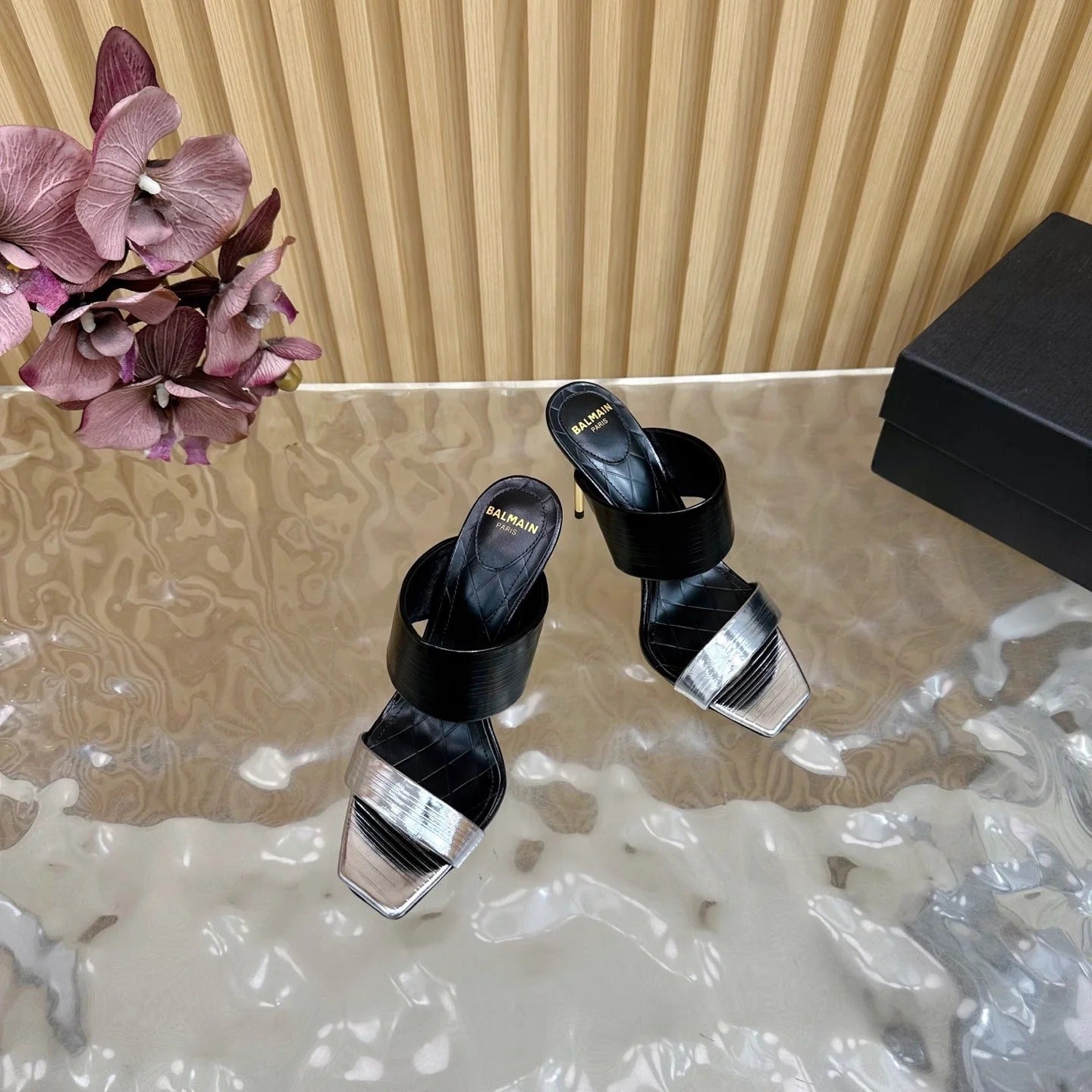 BALMAIN 25S MULES IN STRIPED LEATHER 95MM IN BLACK AND SILVER CALFSKIN