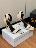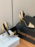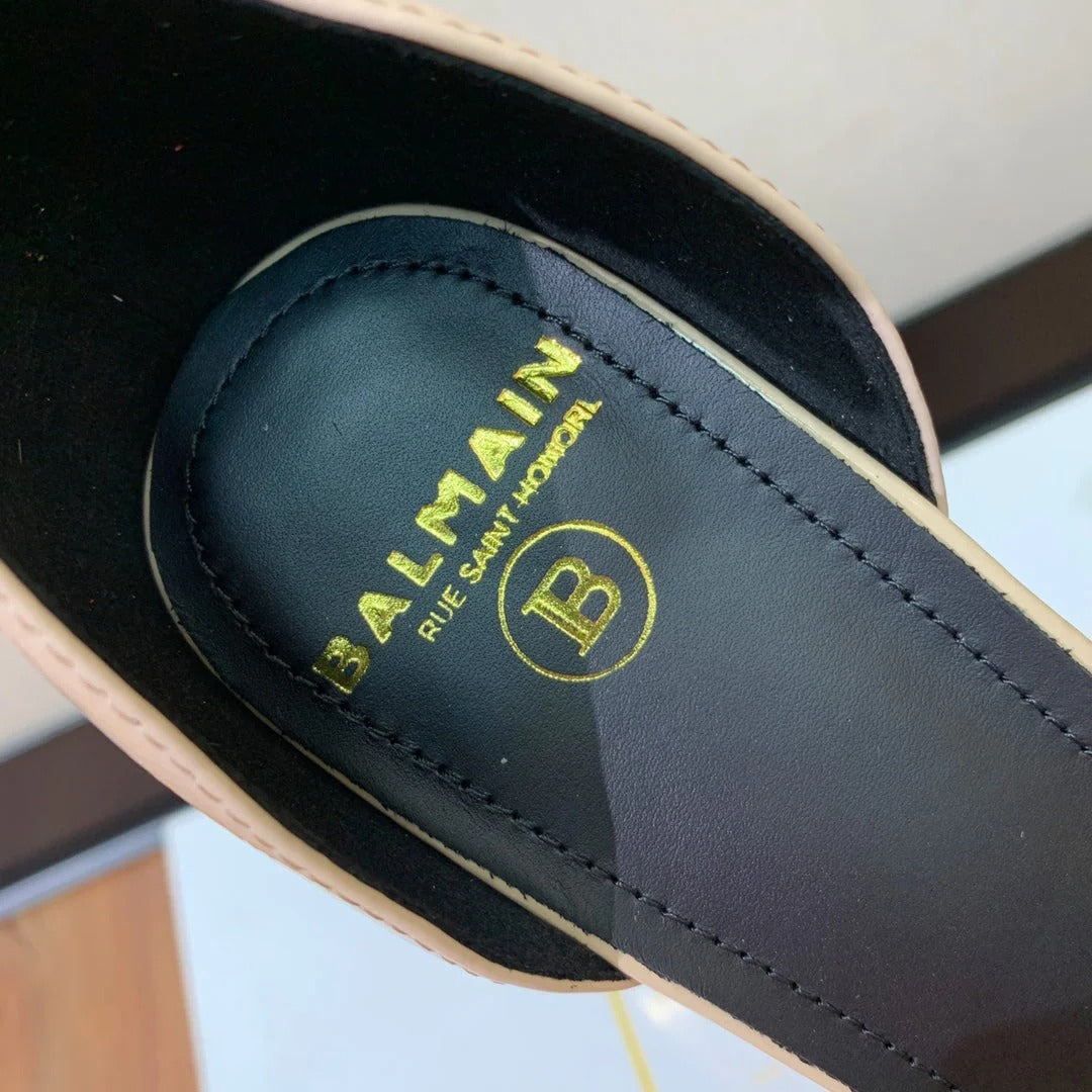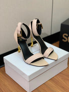 BALMAIN 25S SQUARE STRAP HIGH HEELS 100MM IN BEIGE PATENT CALFSKIN
