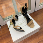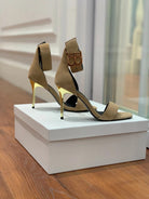 BALMAIN 25S THIN STRAP HIGH HEELS 105MM IN LIGHT MOCHA SUEDE GOLD HARDWARE