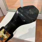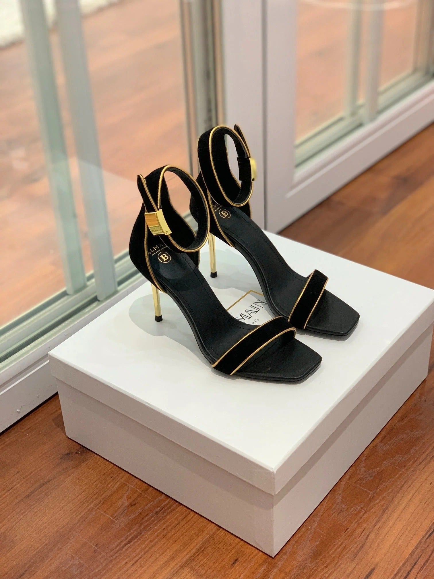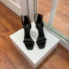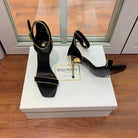 BALMAIN 25S UMA HEELED SANDALS 105MM IN BLACK SUEDE GOLD HARDWARE
