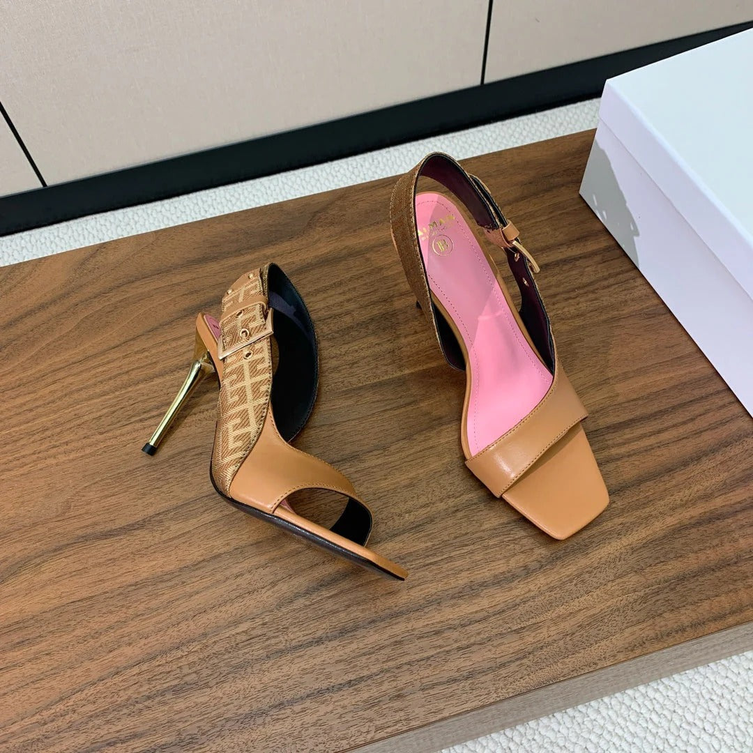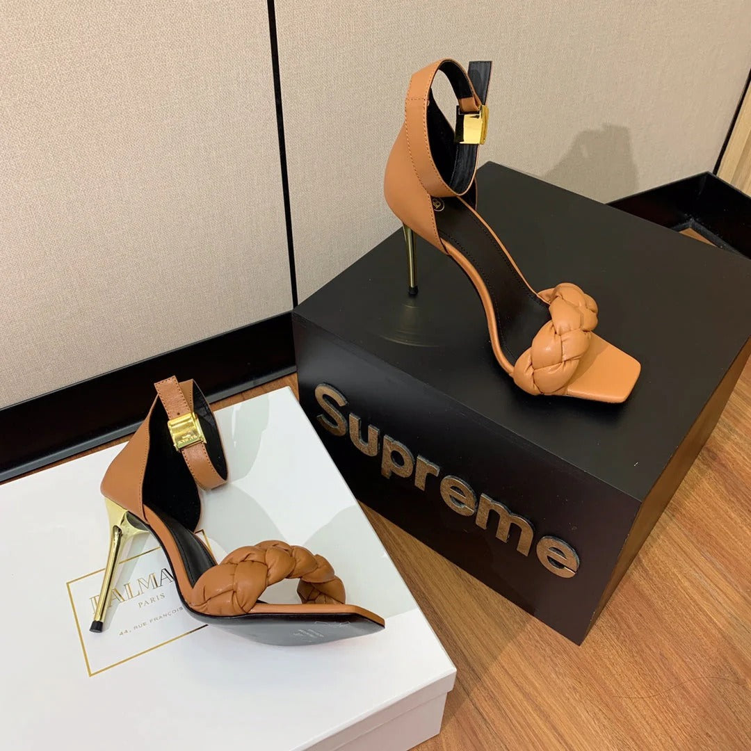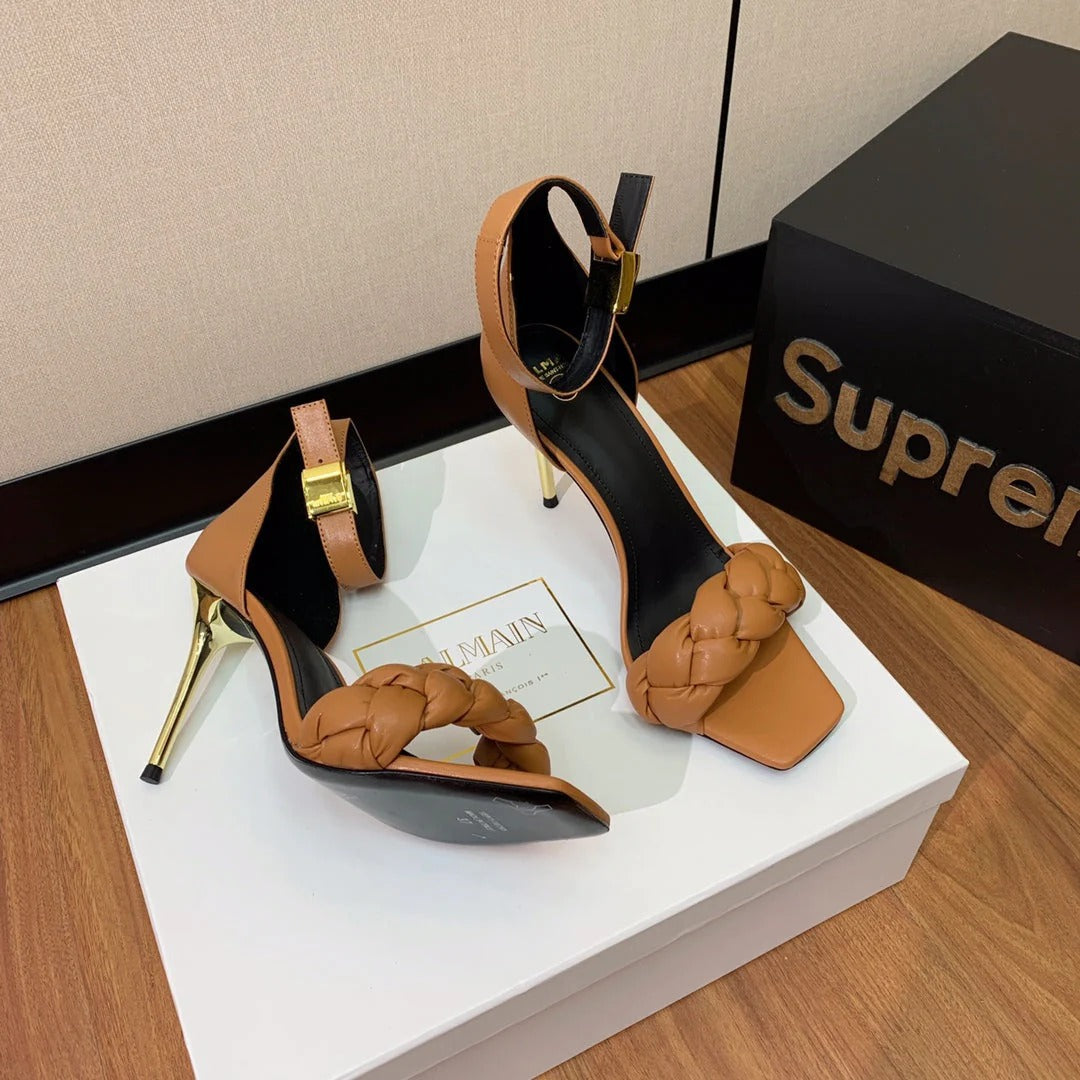 BALMAIN 25S SQUARE STRAP HIGH HEELS 100MM IN CARAMEL CALFSKIN