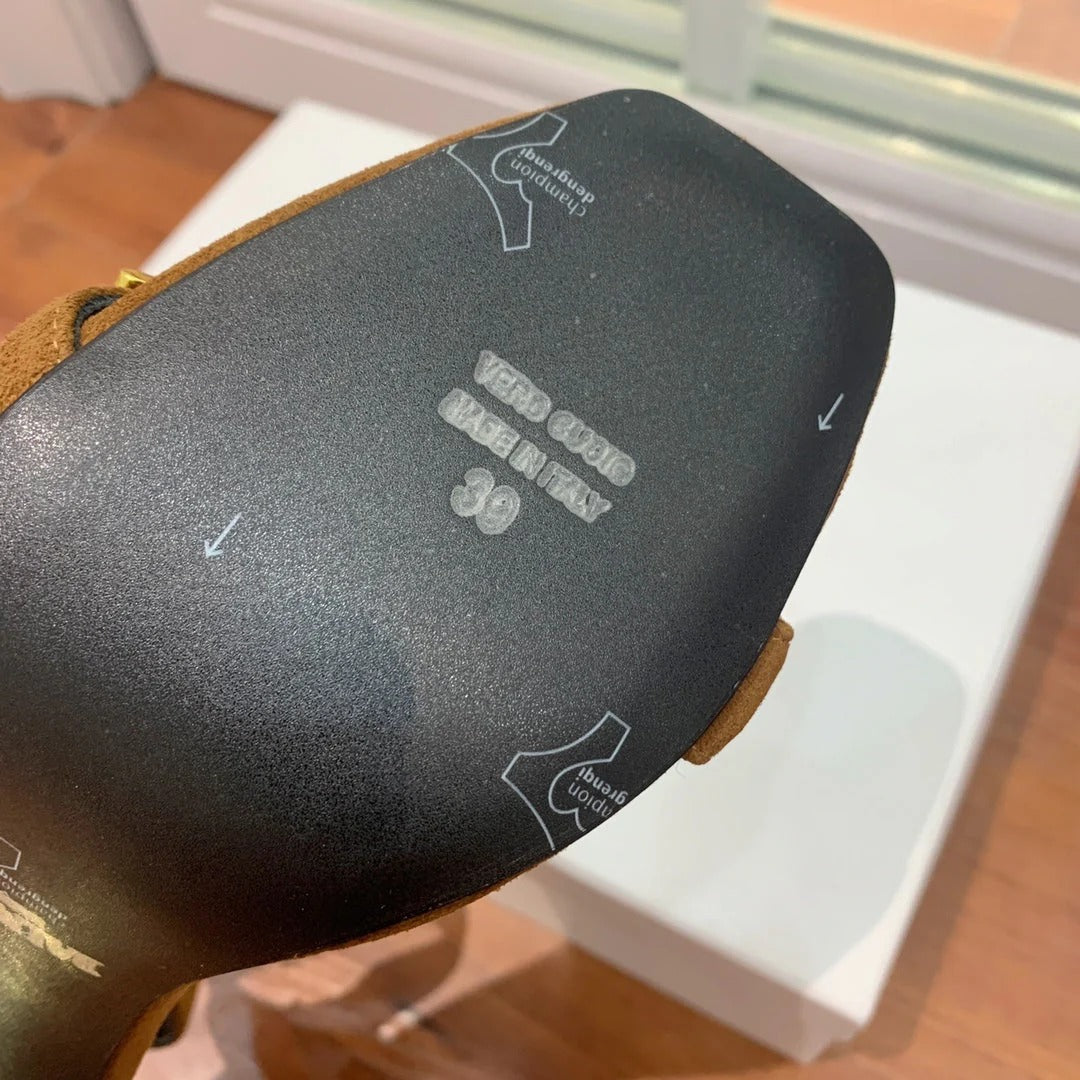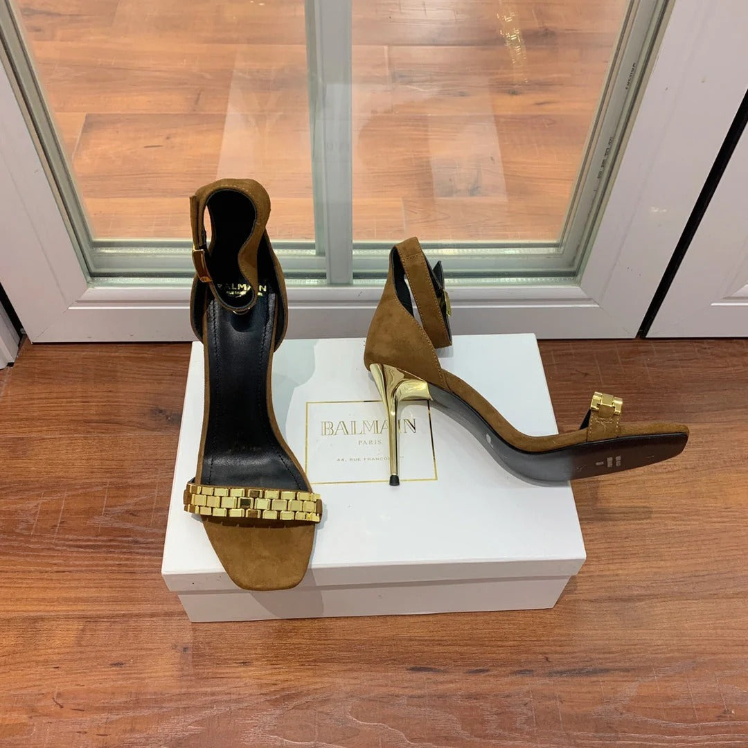 BALMAIN 25S METAL STRAP HIGH HEELS 95MM IN LIGHT BROWN SUEDE GOLD HARDWARE