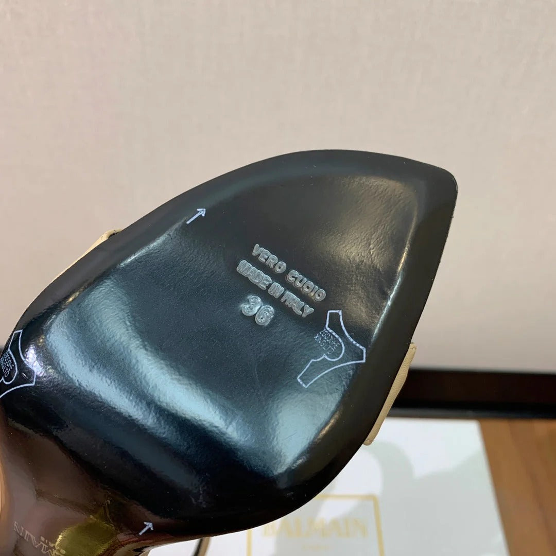 BALMAIN 25S SQUARE STRAP HIGH HEELS 100MM IN BEIGE PATENT CALFSKIN